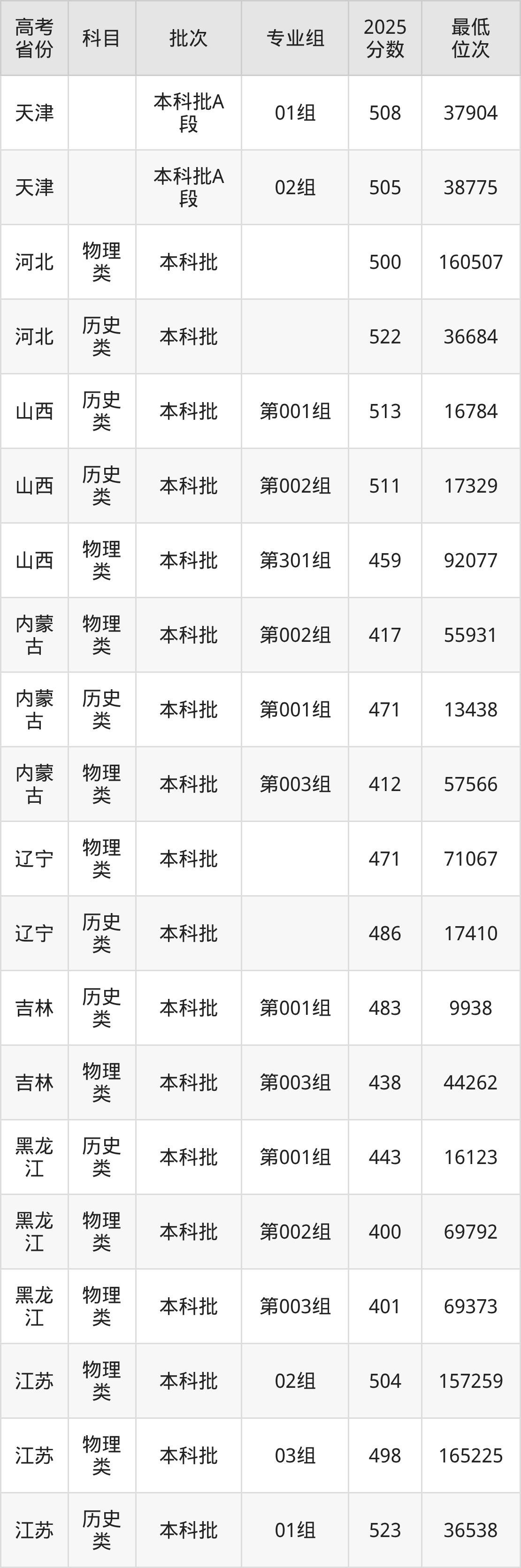 红河学院2025年在全国各省的最低分是400分,在天津招生的最低分是505分、最低位次是38775位,在河北历史类招生的最低分是522分、最低位次是36684位,在河北物理类招生的最低分是500分、最低位次是160507位。