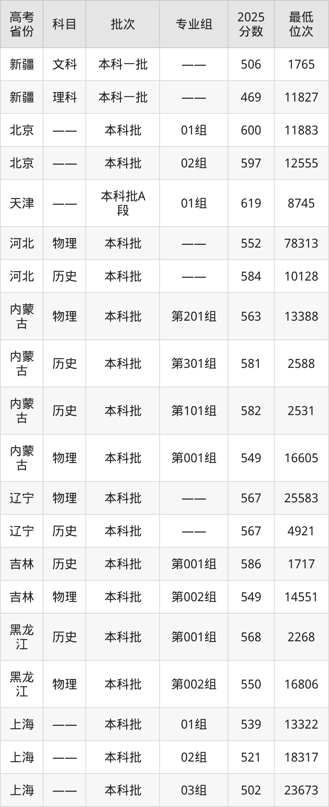 上海政法学院2025年在全国各省的最低分是469分,在上海招生的最低分是498分、最低位次是24798位,在新疆理科招生的最低分是469分、最低位次是11827位,在新疆文科招生的最低分是506分、最低位次是1765位。