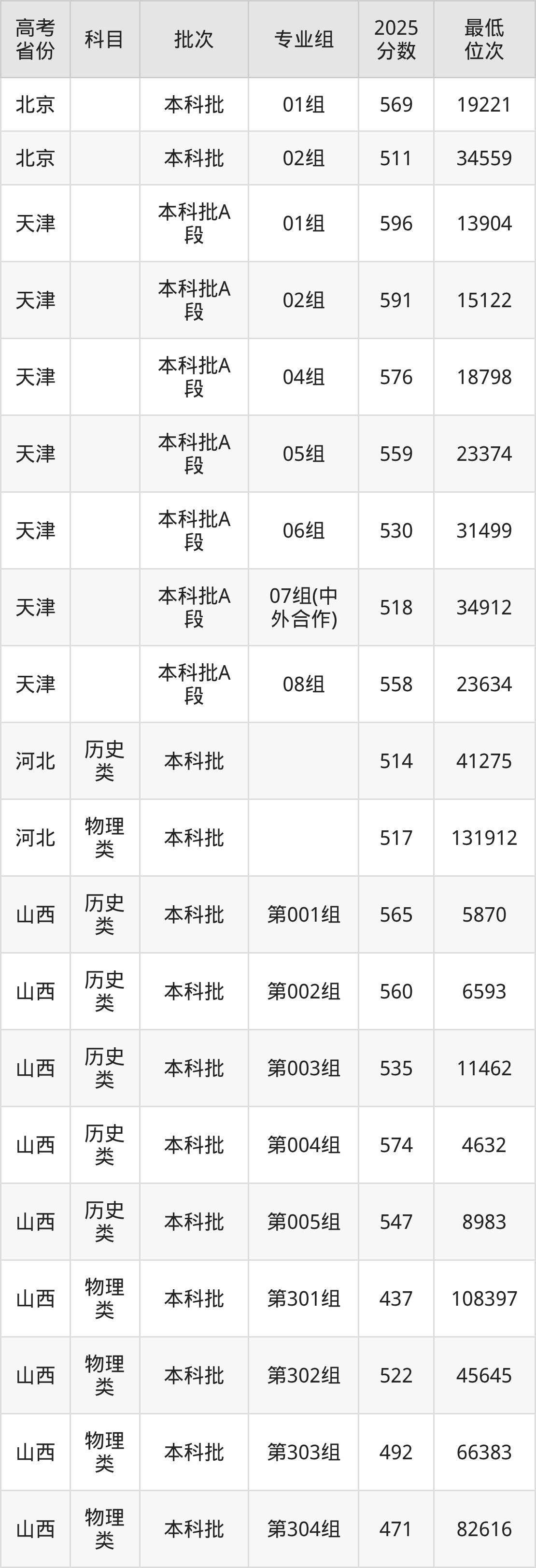 河北师范大学2025年在全国各省的最低分是403分,在河北历史类招生的最低分是514分、最低位次是41275位,在河北物理类招生的最低分是517分、最低位次是131912位,在北京招生的最低分是511分、最低位次是34559位。