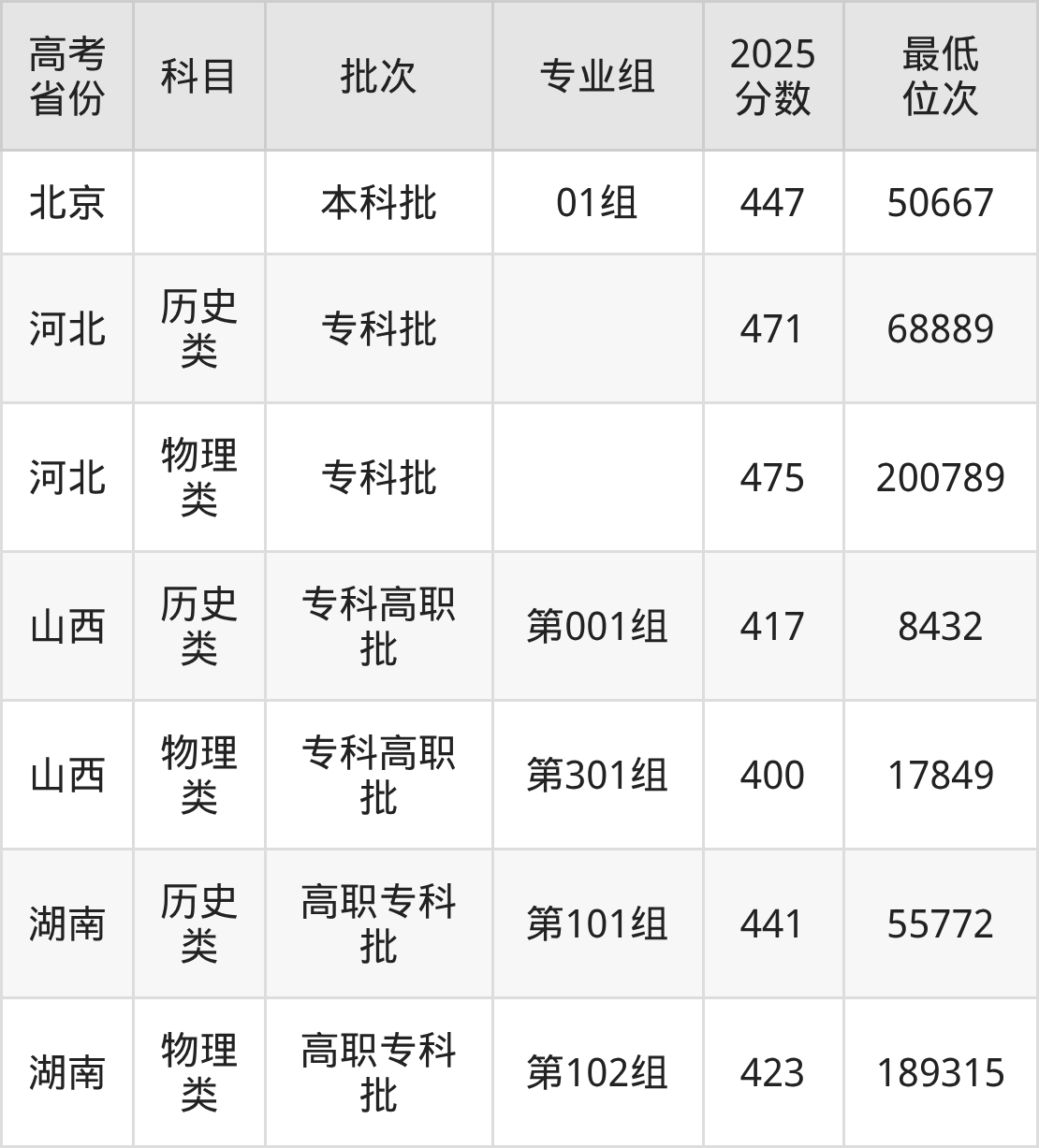 首钢工学院2025年在全国各省的最低分是400分,在北京招生的最低分是447分、最低位次是50667位,在河北历史类招生的最低分是471分、最低位次是68889位,在河北物理类招生的最低分是475分、最低位次是200789位。