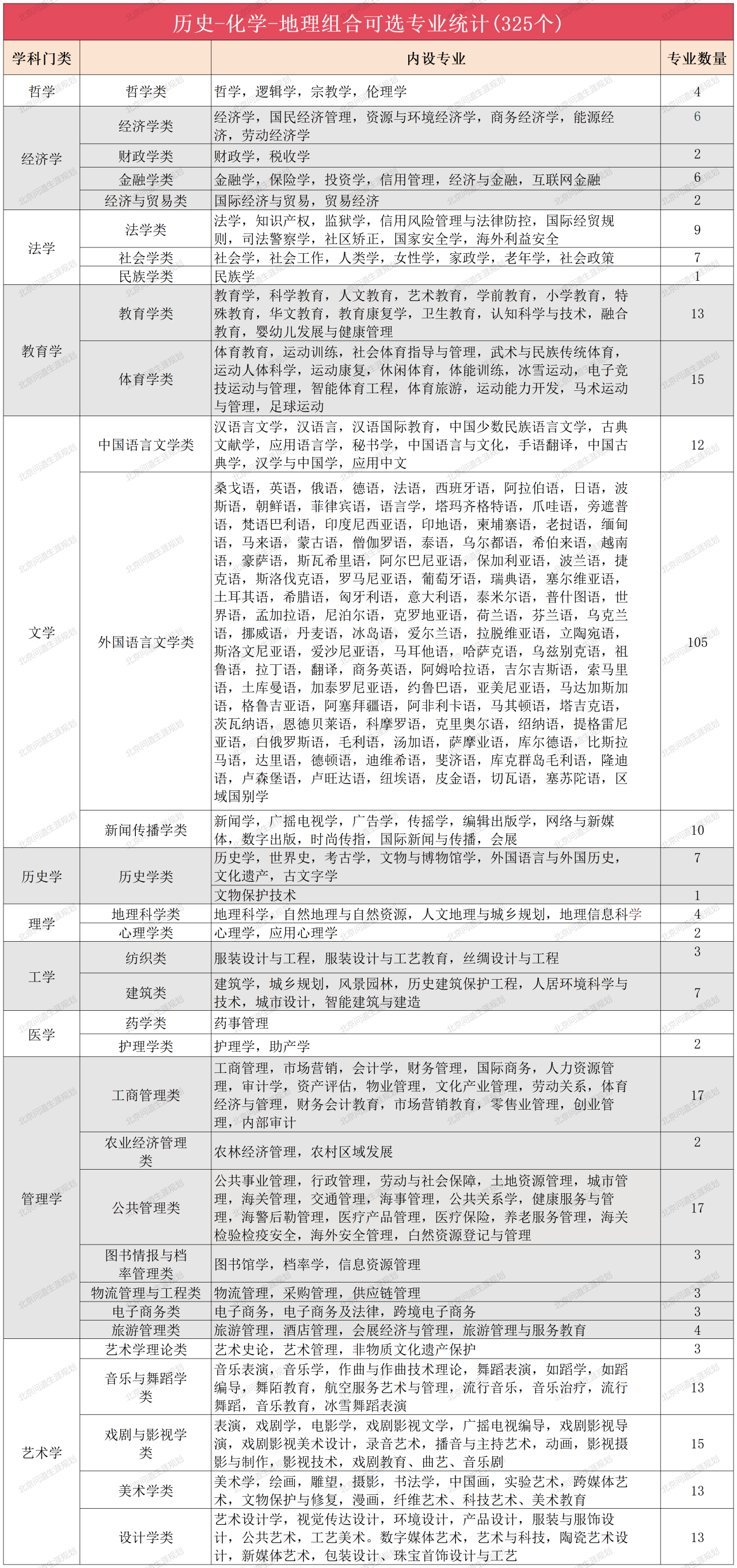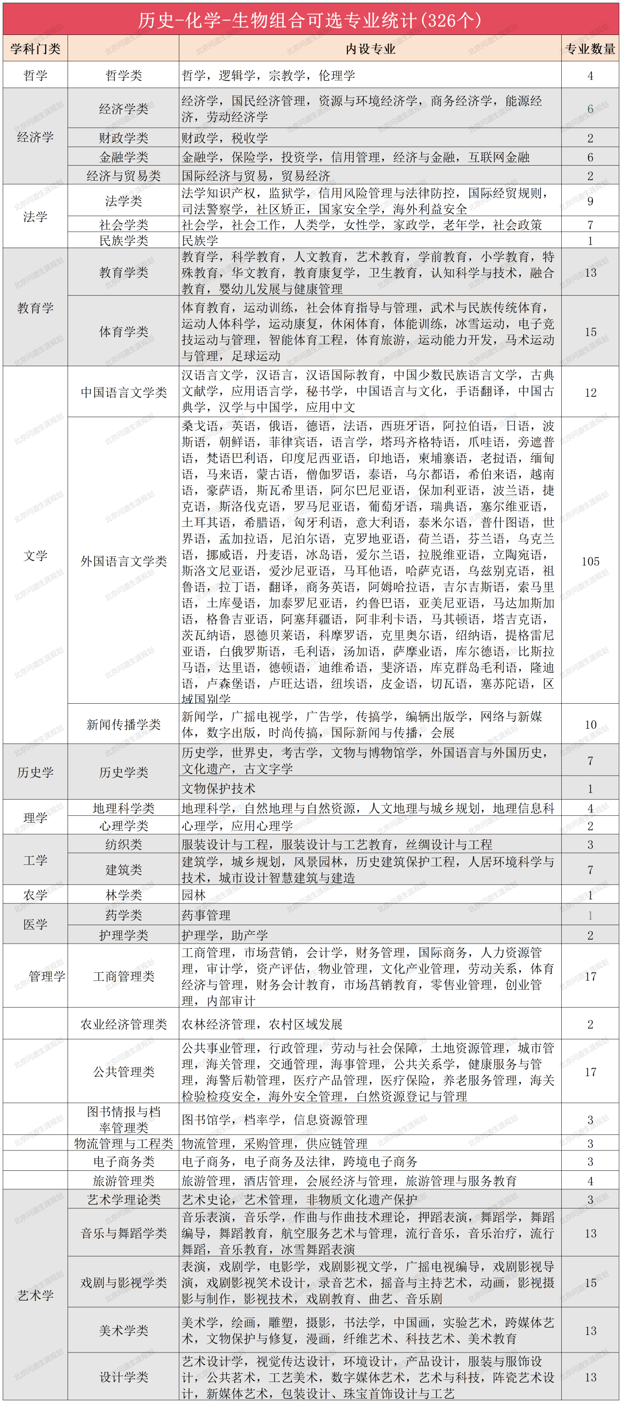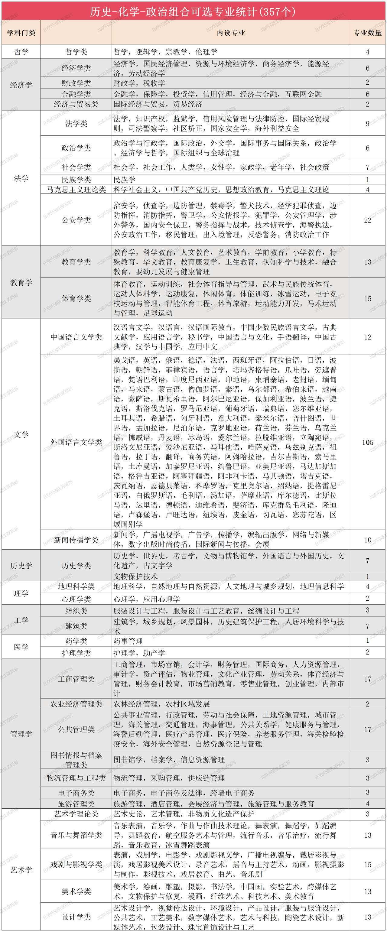 覆盖如历史学、化学、生物科学、药学、医学技术类、中医学等专业。但相比“物化生”组合,在部分高校的理工科热门专业选择上受限。
