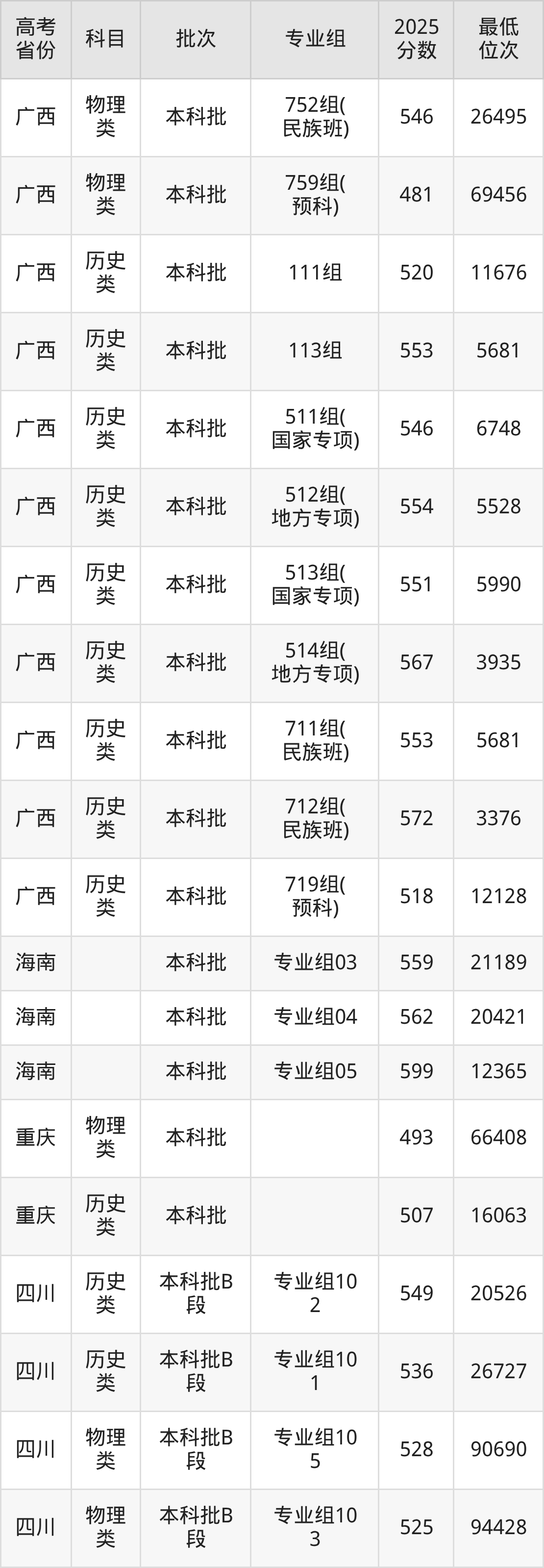 2026届高考生请重点参考下表,若你的高考成绩超过了广西师范大学往年在你省的最低录取分及位次,那么2026年被录取的概率也会比较高: