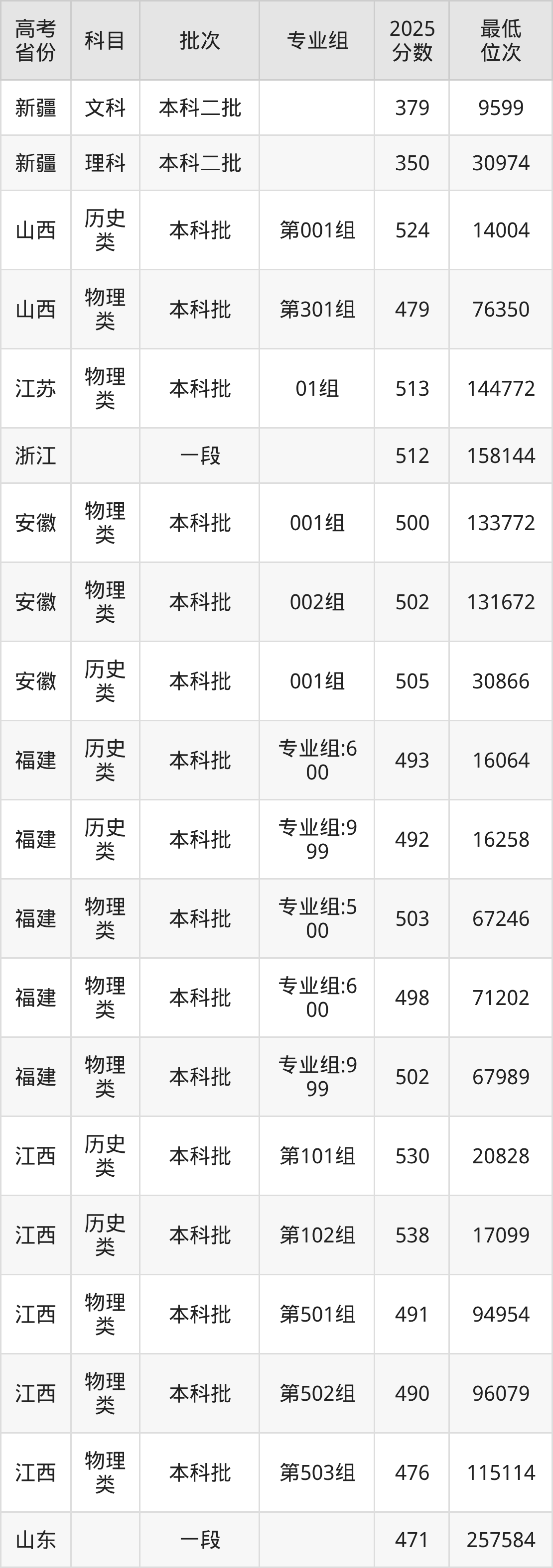 宁德师范学院2025年在全国各省的最低分是350分,在福建历史类招生的最低分是492分、最低位次是16258位,在福建物理类招生的最低分是498分、最低位次是71202位,在新疆理科招生的最低分是350分、最低位次是30974位。