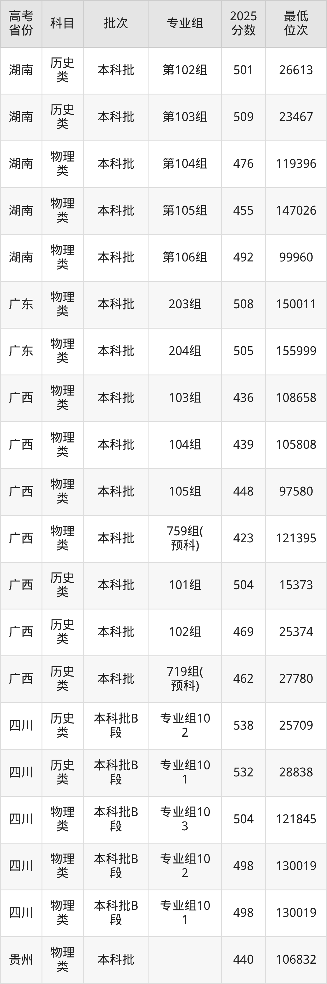 | 学校 代码 | 科目 | 2025年 专业组 | 专业 代码 | 2025年 专业名称 | 收费 标准 |