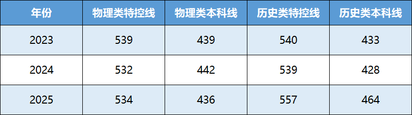 从这三年趋势看:物理类特控线和本科线整体小幅波动,特控线在532-539分之间调整,本科线在436-442分之间变化,竞争格局相对稳定;而历史类分数线呈明显上升趋势,尤其是2025年,特控线较2024年上涨18分,本科线上涨36分,说明历史类高考的竞争压力在持续增大,这也和本次二调历史类本科线上涨的信号相呼应。