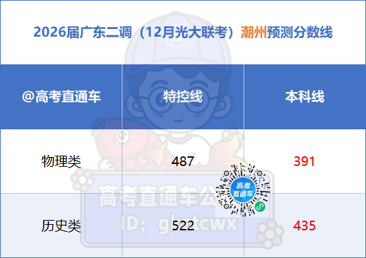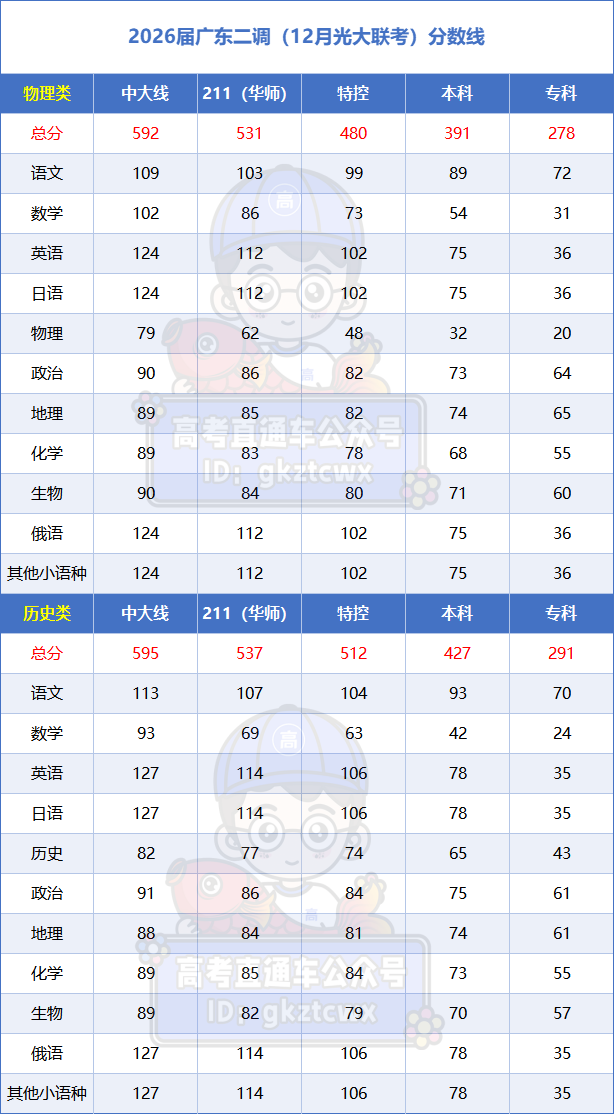 2026届广东高三第二次调研考试(即“12月光大联考”)的分数线已于近日公布。根据公布的总体划线,本次考试物理类本科线为391分,特控线480分;历史类本科线427分,特控线512分。