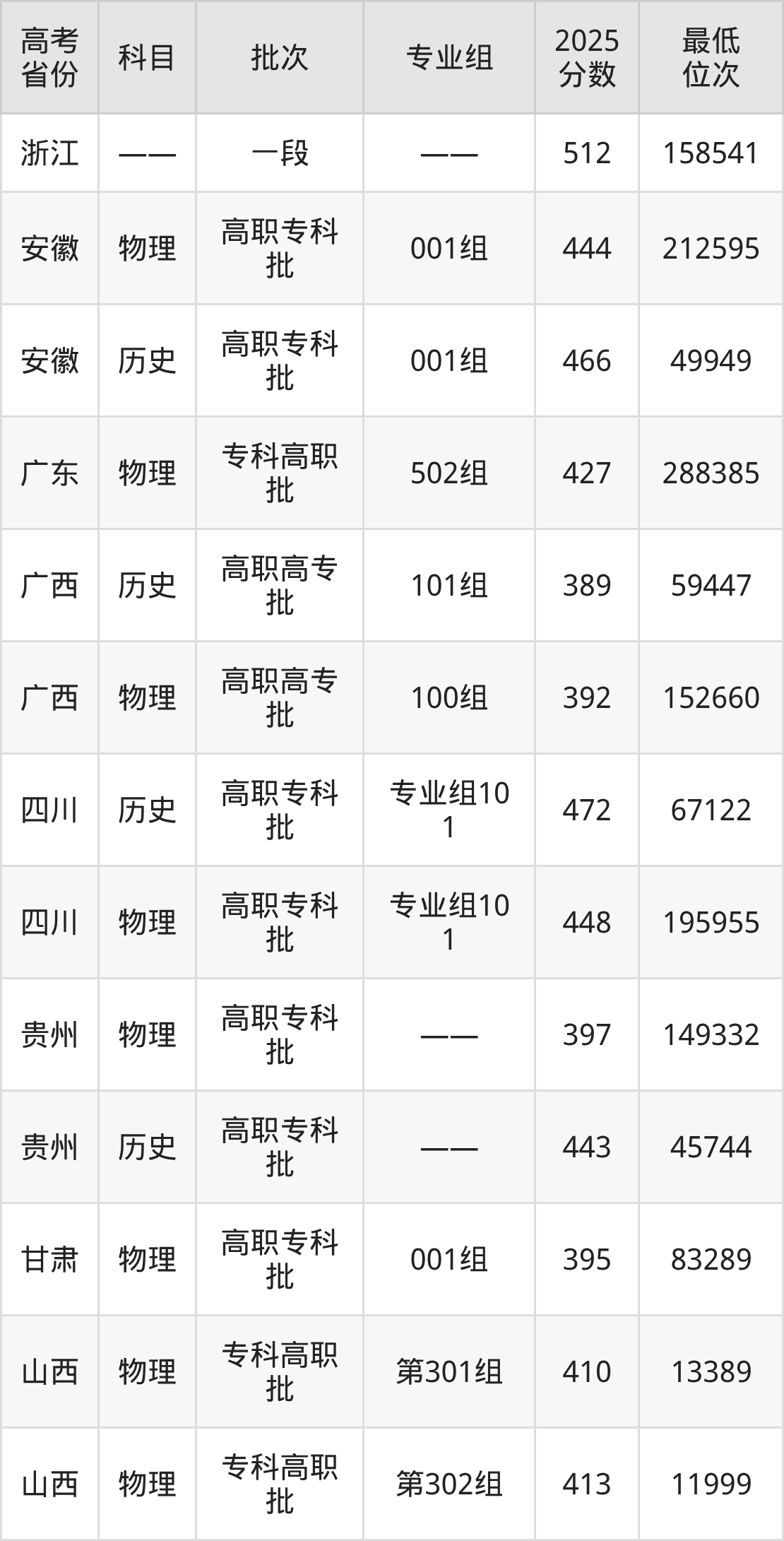 福建电力职业技术学院2025年在全国各省的最低分是389分,在浙江招生的最低分是512分、最低位次是158541位,在安徽物理类招生的最低分是444分、最低位次是212595位,在安徽历史类招生的最低分是466分、最低位次是49949位。