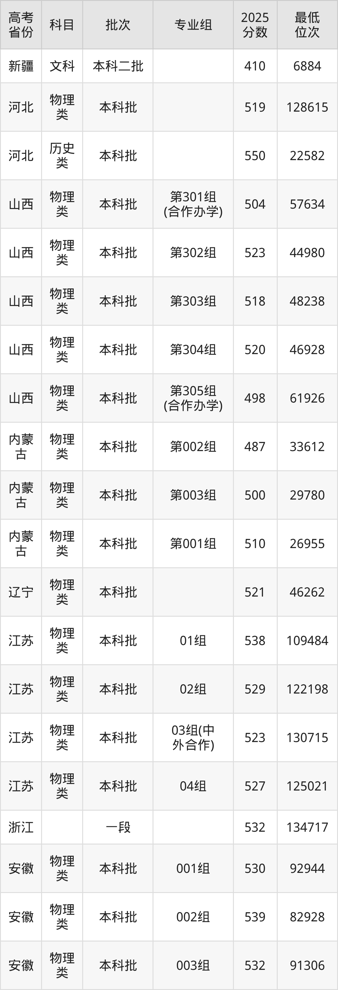 宁波工程学院2025年在全国各省的最低分是410分,在浙江招生的最低分是532分、最低位次是134717位,在新疆文科招生的最低分是410分、最低位次是6884位,在河北物理类招生的最低分是519分、最低位次是128615位。