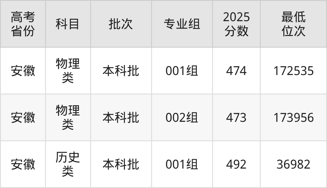 合肥经济学院2025年在安徽物理类招生的最低分是473分、最低位次是173956位,在安徽历史类招生的最低分是492分、最低位次是36982位。
