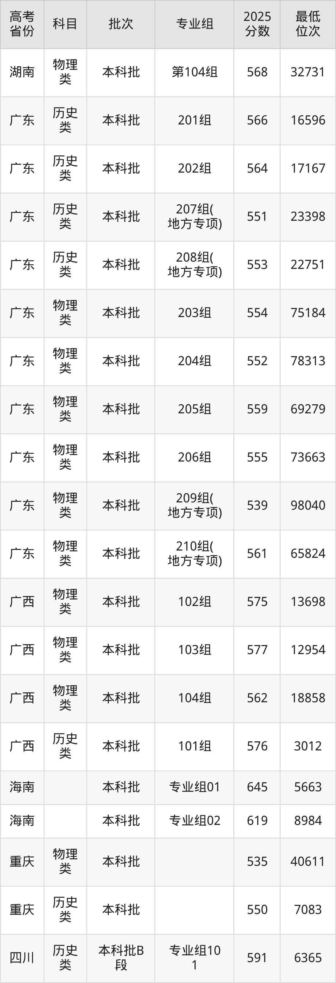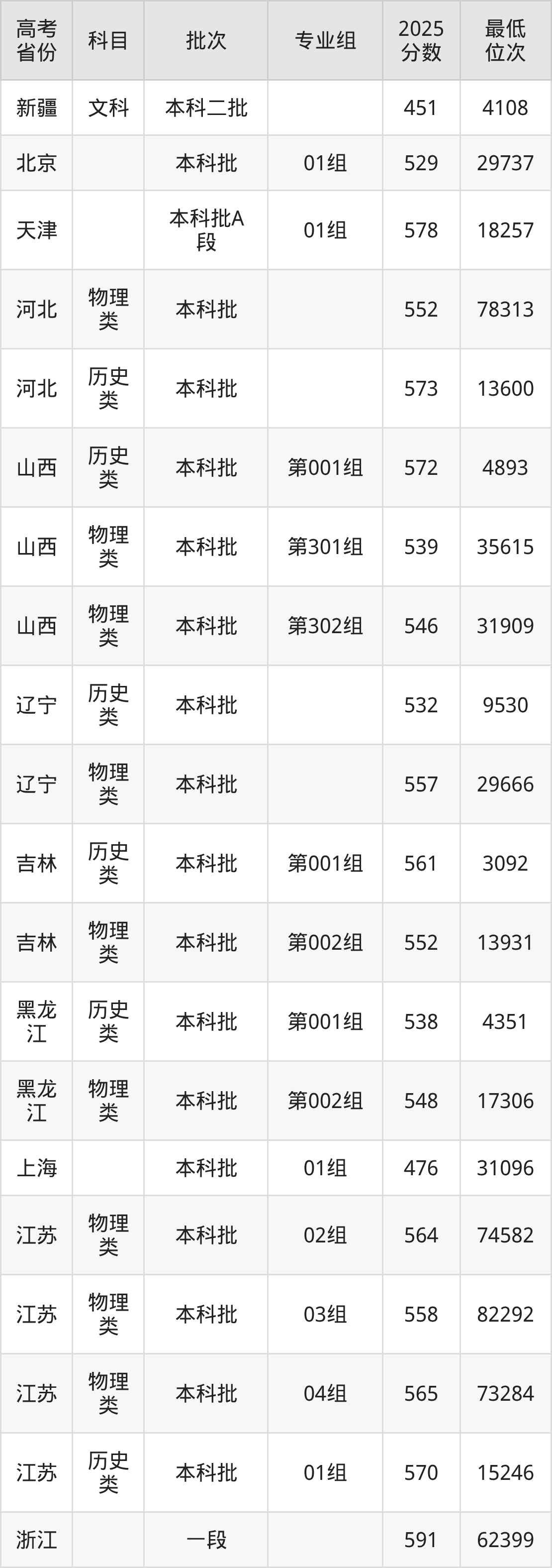 汕头大学2025年在全国各省的最低分是451分,在广东历史类招生的最低分是551分、最低位次是23398位,在广东物理类招生的最低分是539分、最低位次是98040位,在新疆文科招生的最低分是451分、最低位次是4108位。