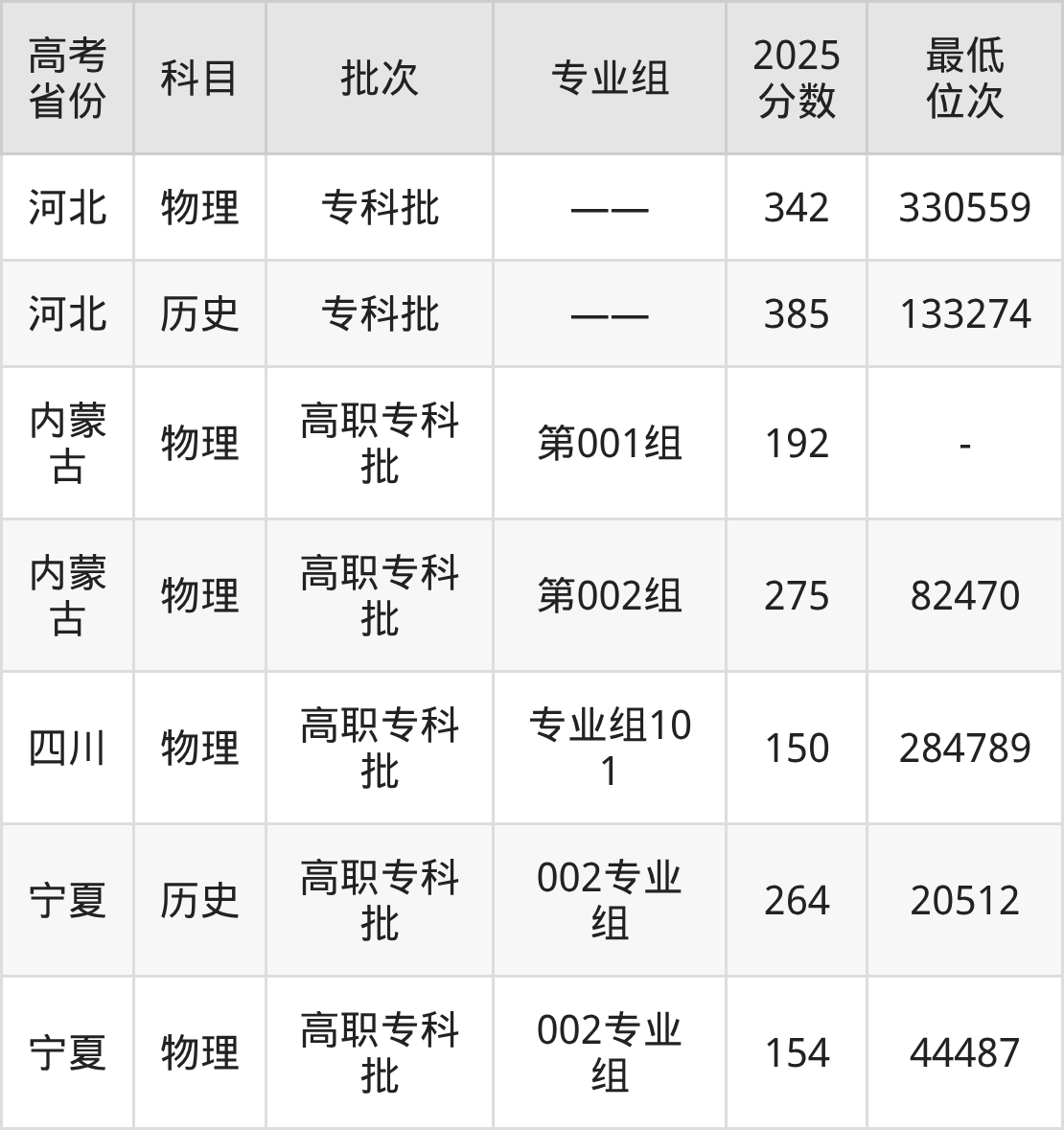 石嘴山工贸职业技术学院2025年在全国各省的最低分是150分,在宁夏历史类招生的最低分是264分、最低位次是20512位,在宁夏物理类招生的最低分是154分、最低位次是44487位,在河北物理类招生的最低分是342分、最低位次是330559位。
