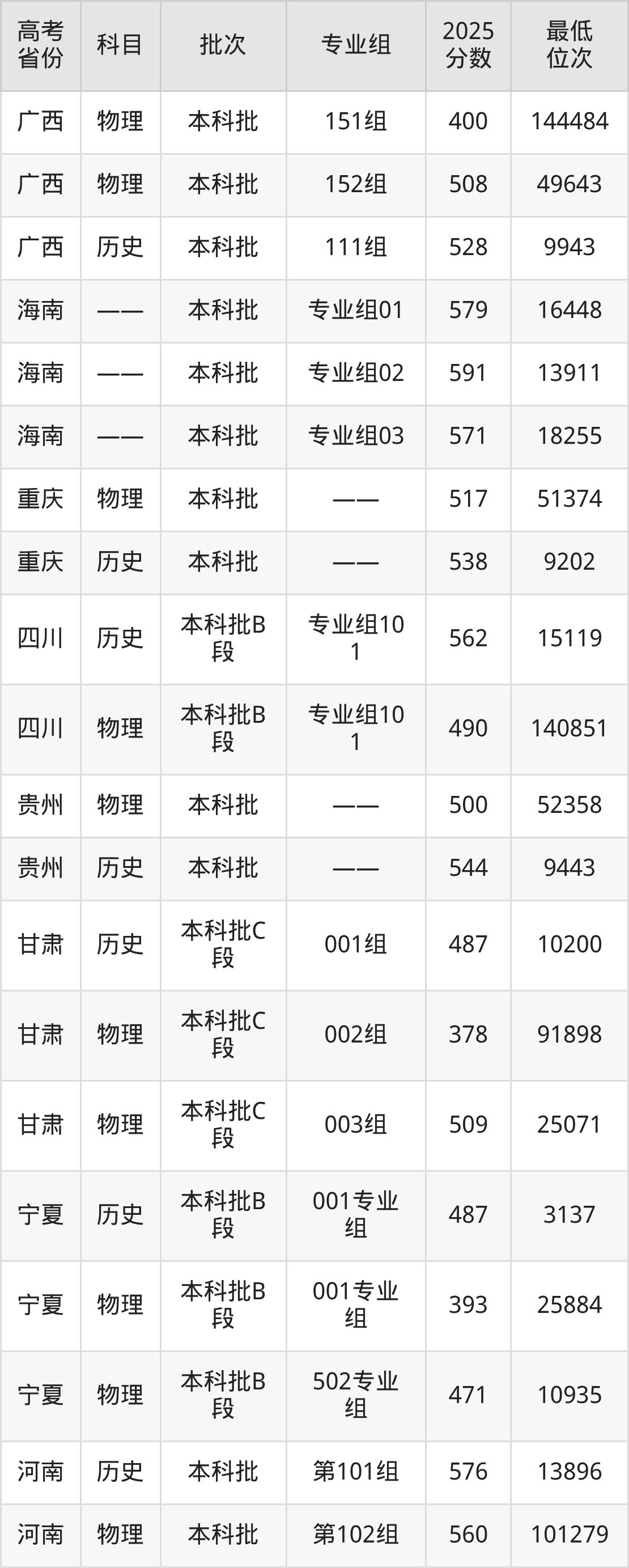 | 学校 代码 | 科目 | 2025年 专业组 | 专业 代码 | 2025年 专业名称 | 收费 标准 |