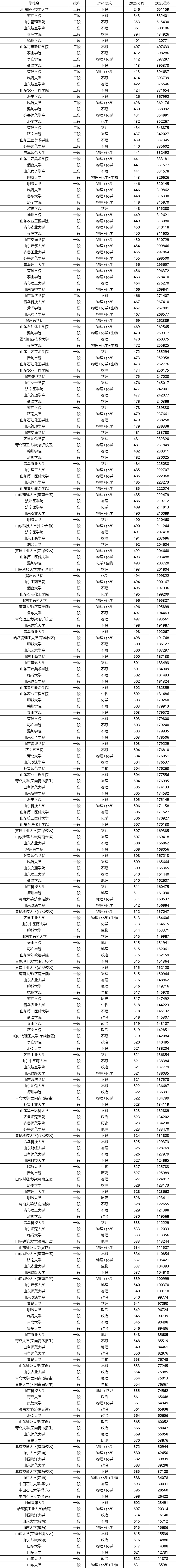 以下以山东省2025年普通高校招生录取数据为例,按录取分数从高到低分梯度展示各类公办本科院校的投档情况,涵盖“一段”“二段”不同批次与选科要求,帮助考生直观了解各层次院校的分数与位次对应关系。