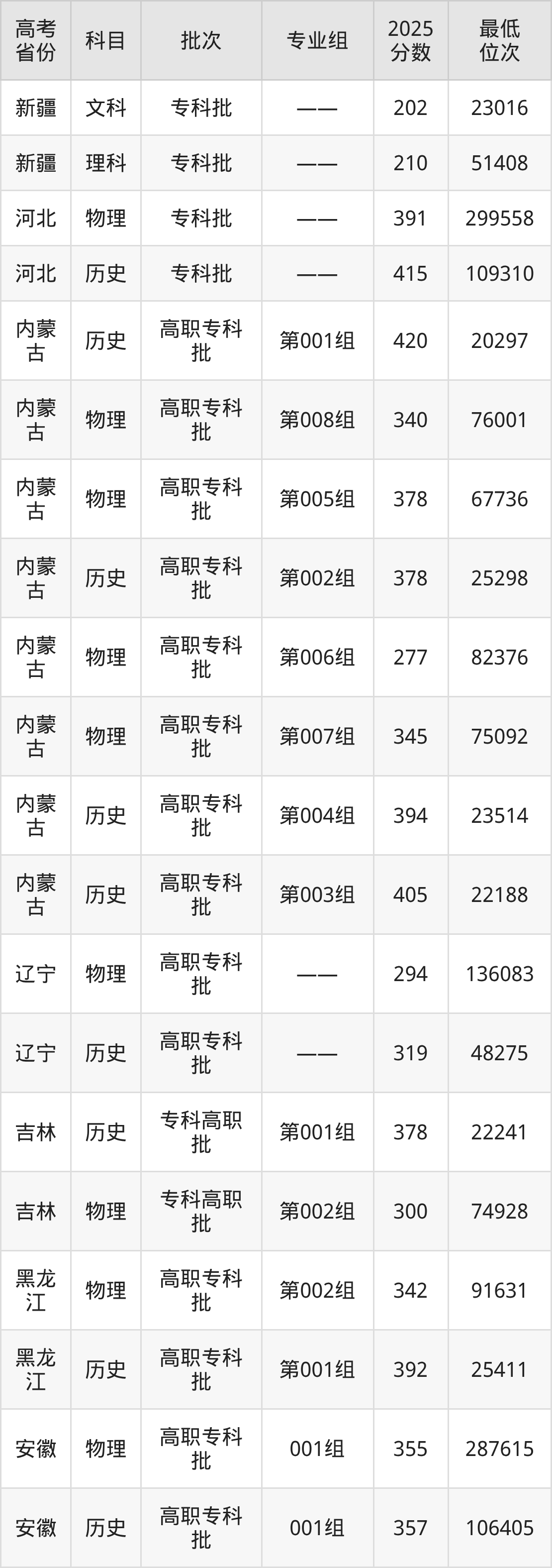 营口职业技术学院2025年在全国各省的最低分是202分,在辽宁物理类招生的最低分是294分、最低位次是136083位,在辽宁历史类招生的最低分是319分、最低位次是48275位,在新疆文科招生的最低分是202分、最低位次是23016位。