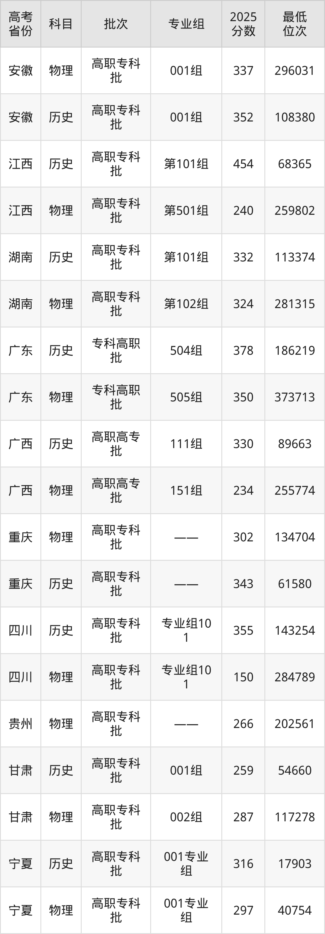 湘南幼儿师范高等专科学校2025年在全国各省的最低分是150分,在湖南历史类招生的最低分是332分、最低位次是113374位,在湖南物理类招生的最低分是324分、最低位次是281315位,在安徽物理类招生的最低分是337分、最低位次是296031位。
