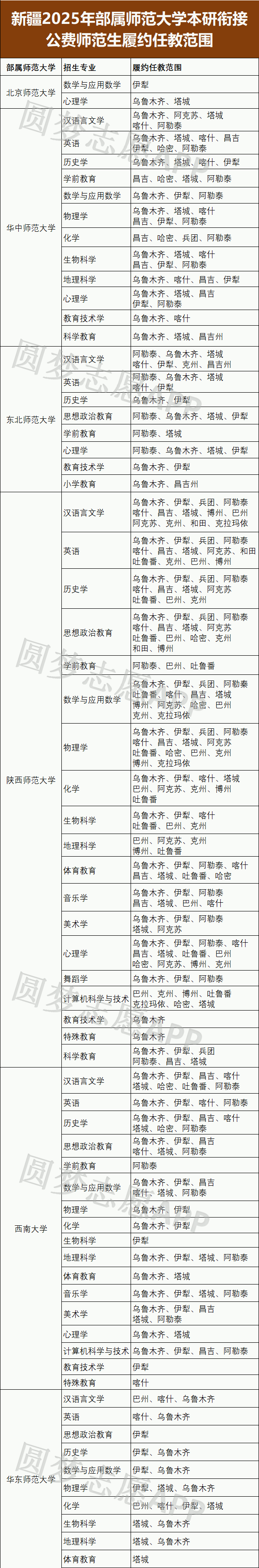 以下为2025年新疆部属师范大学本硕衔接公费师范生履约任教区域整理,2026届考生在选择院校和专业时可重点参考: