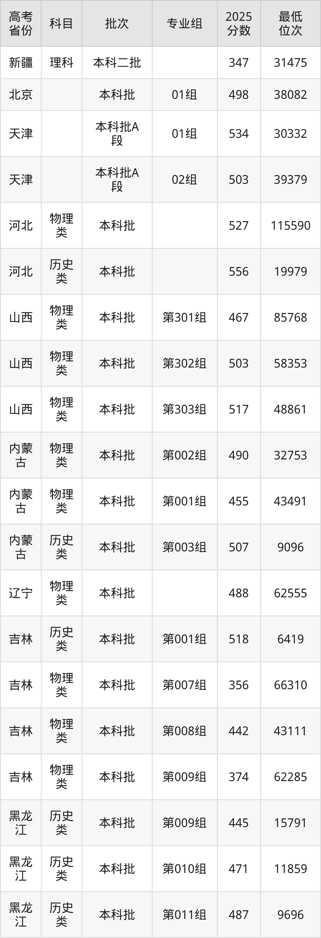 佳木斯大学2025年在全国各省的最低分是347分,在黑龙江历史类招生的最低分是376分、最低位次是28722位,在黑龙江物理类招生的最低分是374分、最低位次是80081位,在新疆理科招生的最低分是347分、最低位次是31475位。