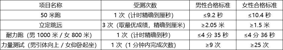 体能测评由陕西省公安厅统一组织,考生需全部参与 4 个项目测评,且3 个及以上项目达标即为合格,具体项目、受测次数及标准如下: