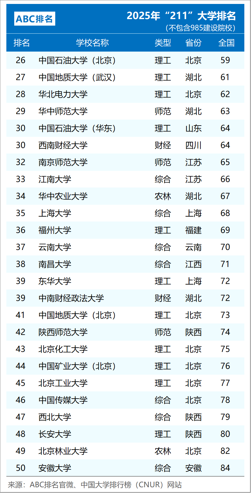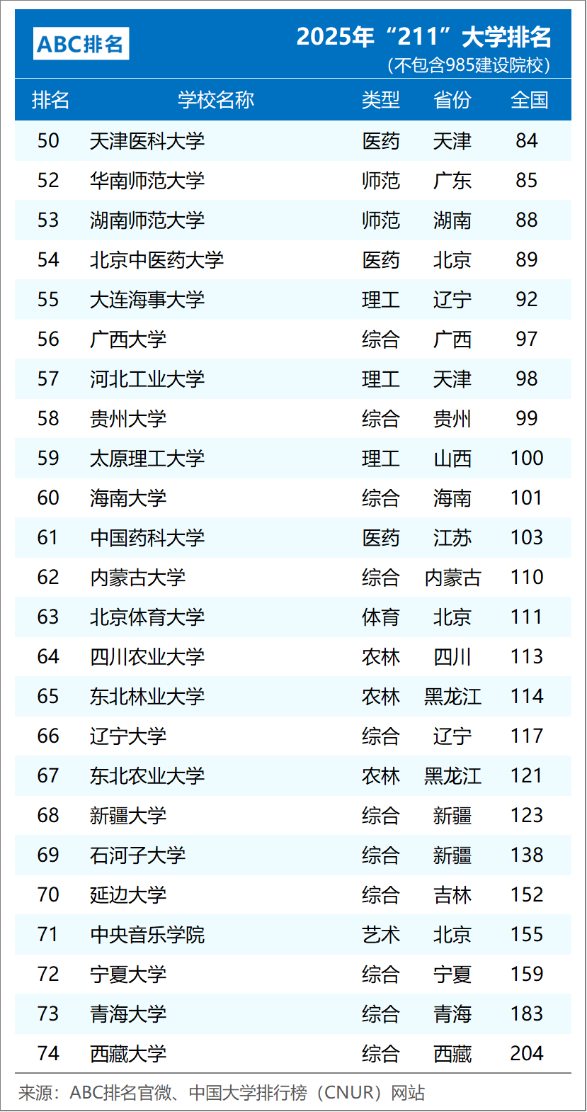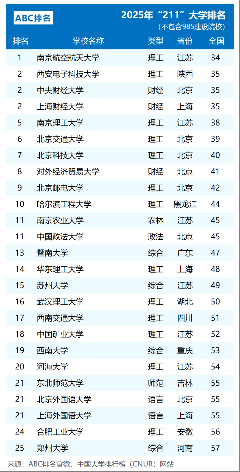 2025年纯211大学共有74所,其中,南京航空航天大学(江苏)、西安电子科技大学(陕西)、中央财经大学(北京)位列前三。