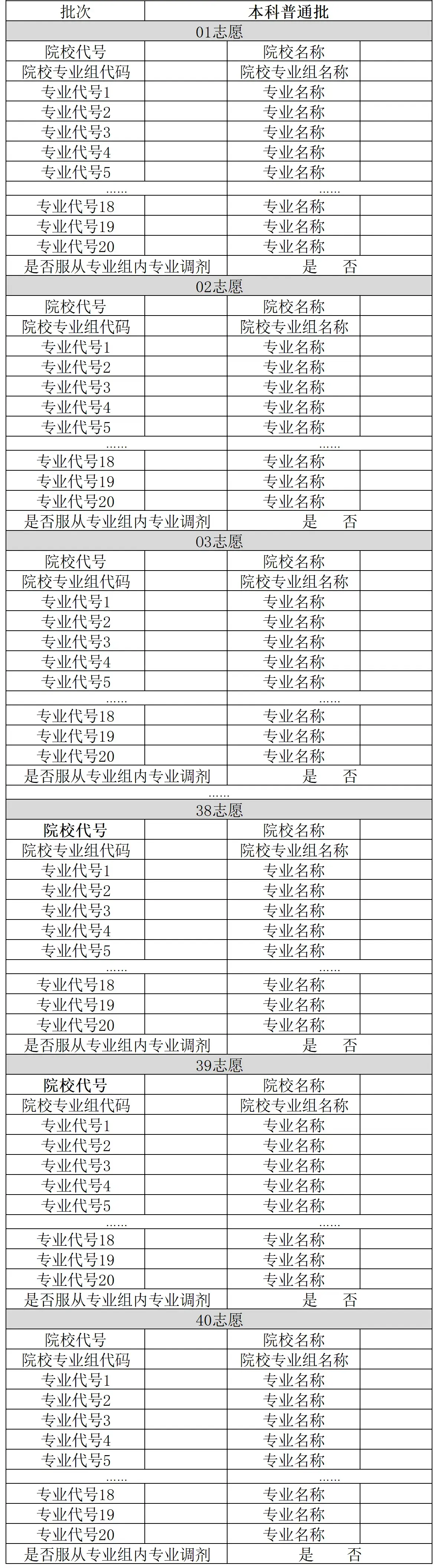 采用平行志愿投档模式,设置20个院校专业组志愿。每个院校专业组志愿内可填报最多20个专业,并设有1个调剂选项。