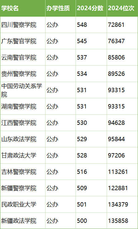 (3)520-530分:甘肃政法大学、山东政法学院、江西警察学院,最低录取位次为第97206名。