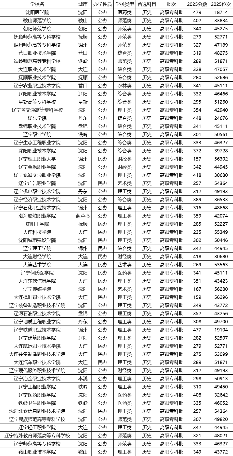 辽宁省内历史类专科院校数量多、分布广,投档分数从150余分至近480分不等,覆盖不同层次和类型的教育需求。