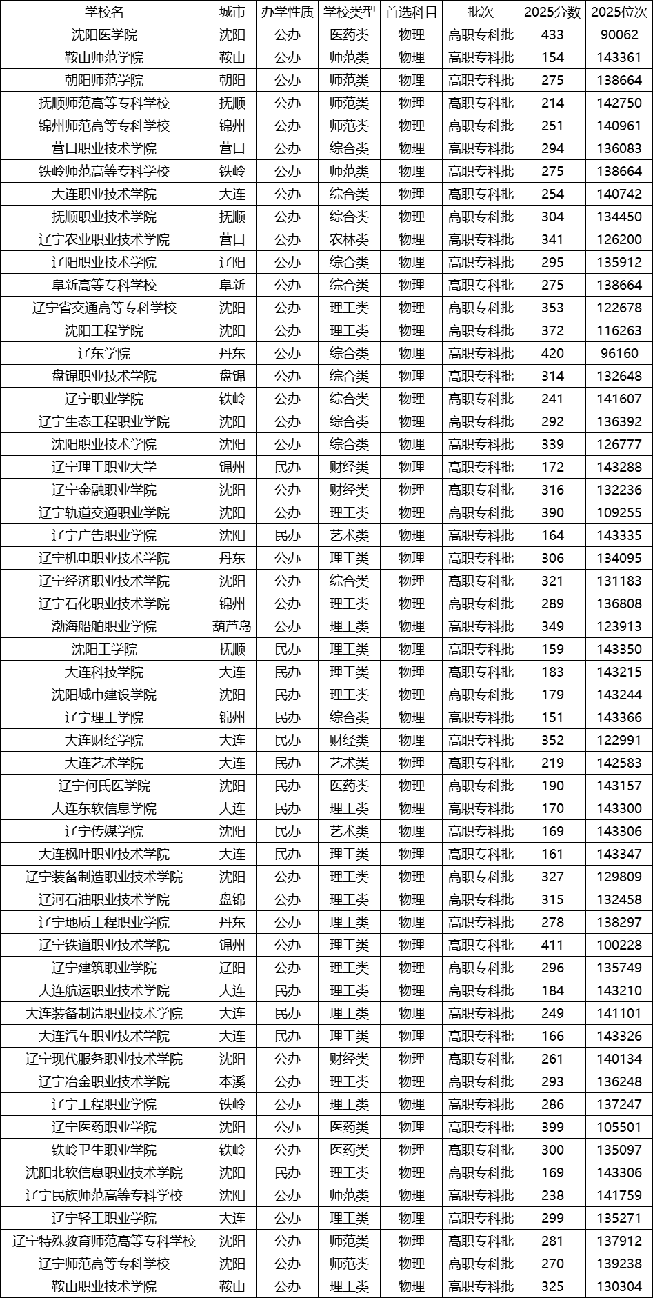辽宁省内专科院校在2025年物理类投档中表现稳定,多数院校分数区间在150分至450分之间,覆盖不同层次考生需求。以下是省内院校的详细解读: