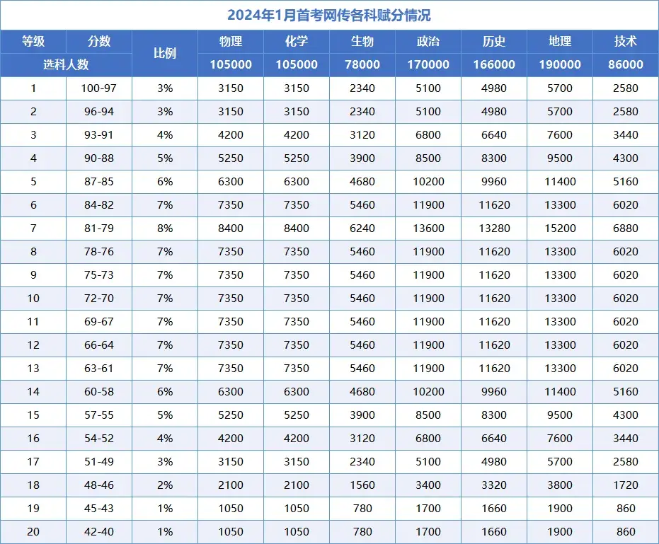 2024年浙江首考赋分表未公布,以下为当年1月首考赋分等级与人数对照表,供查阅: