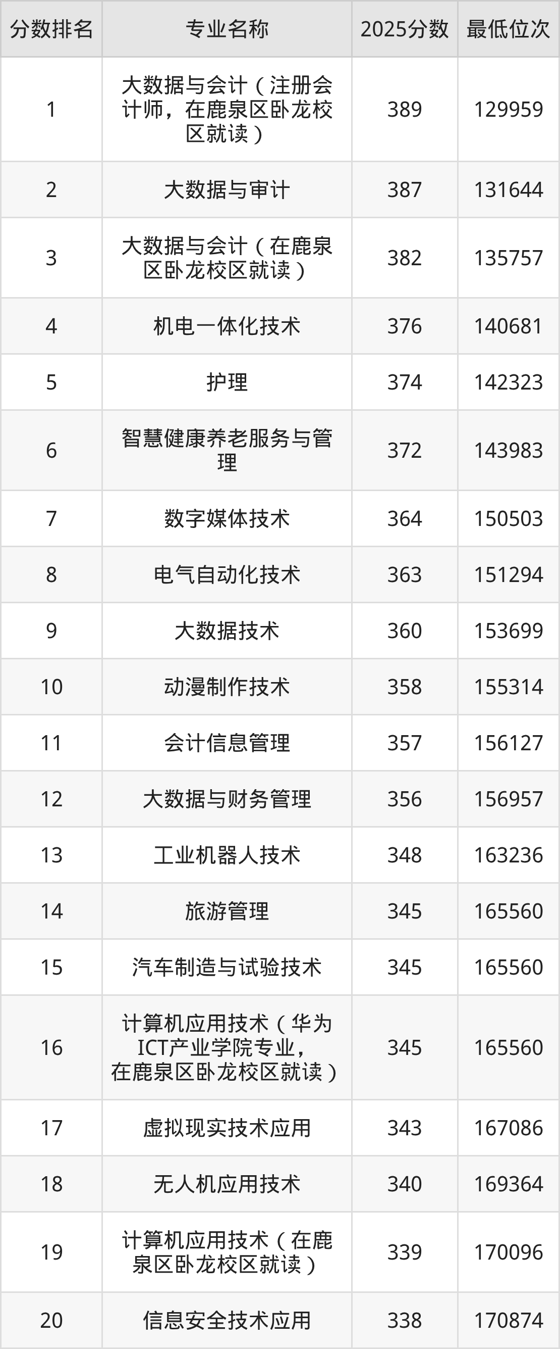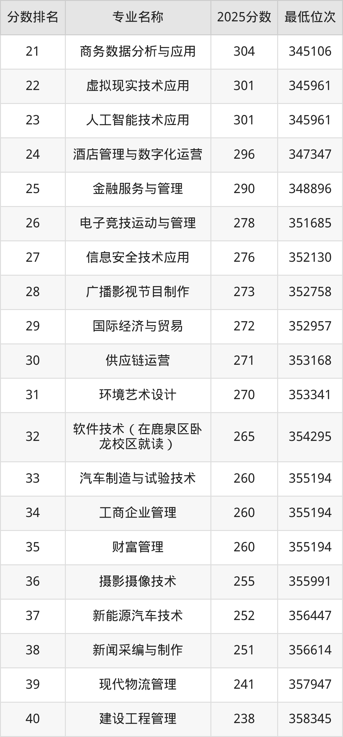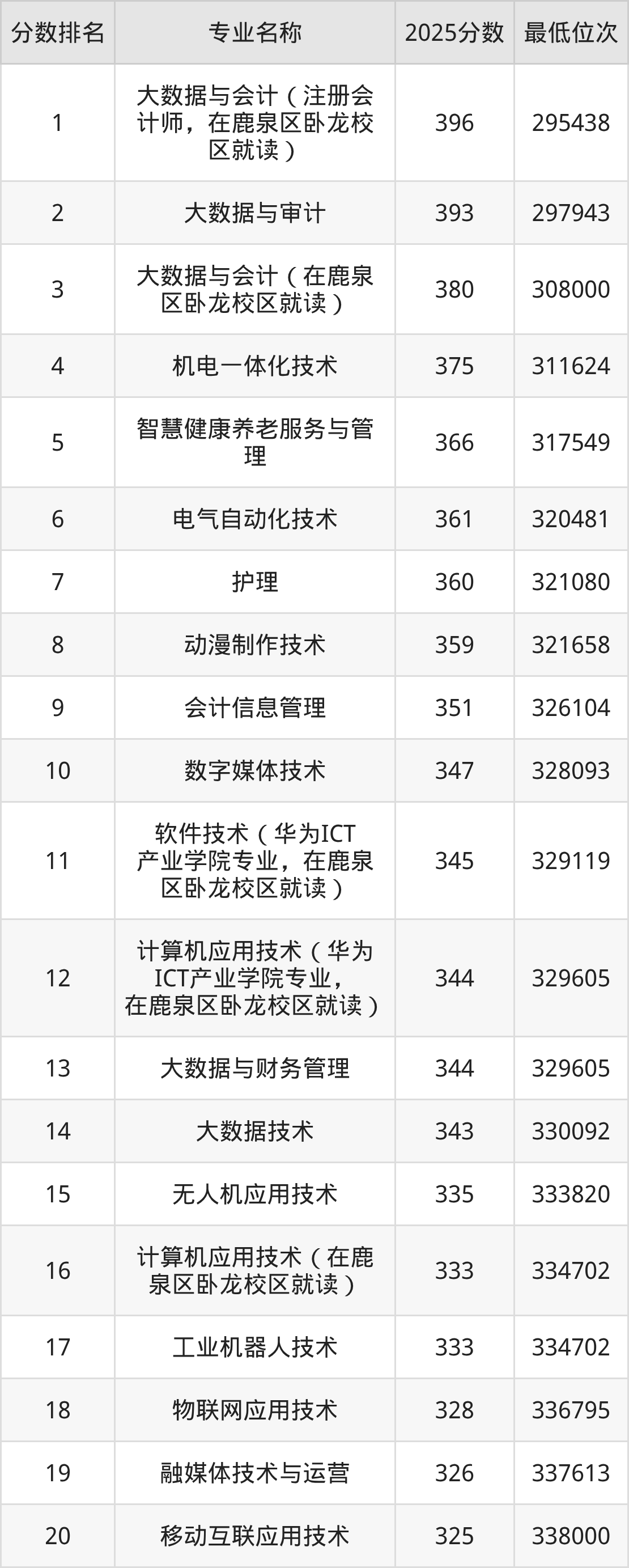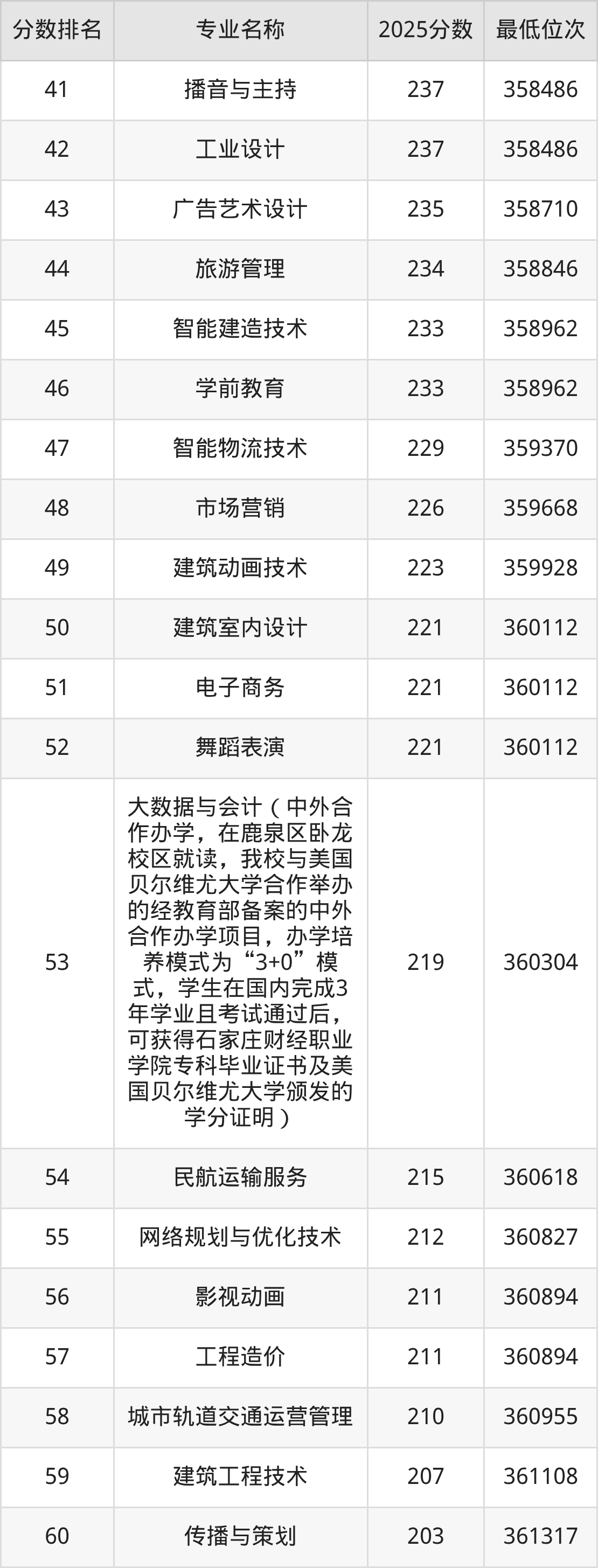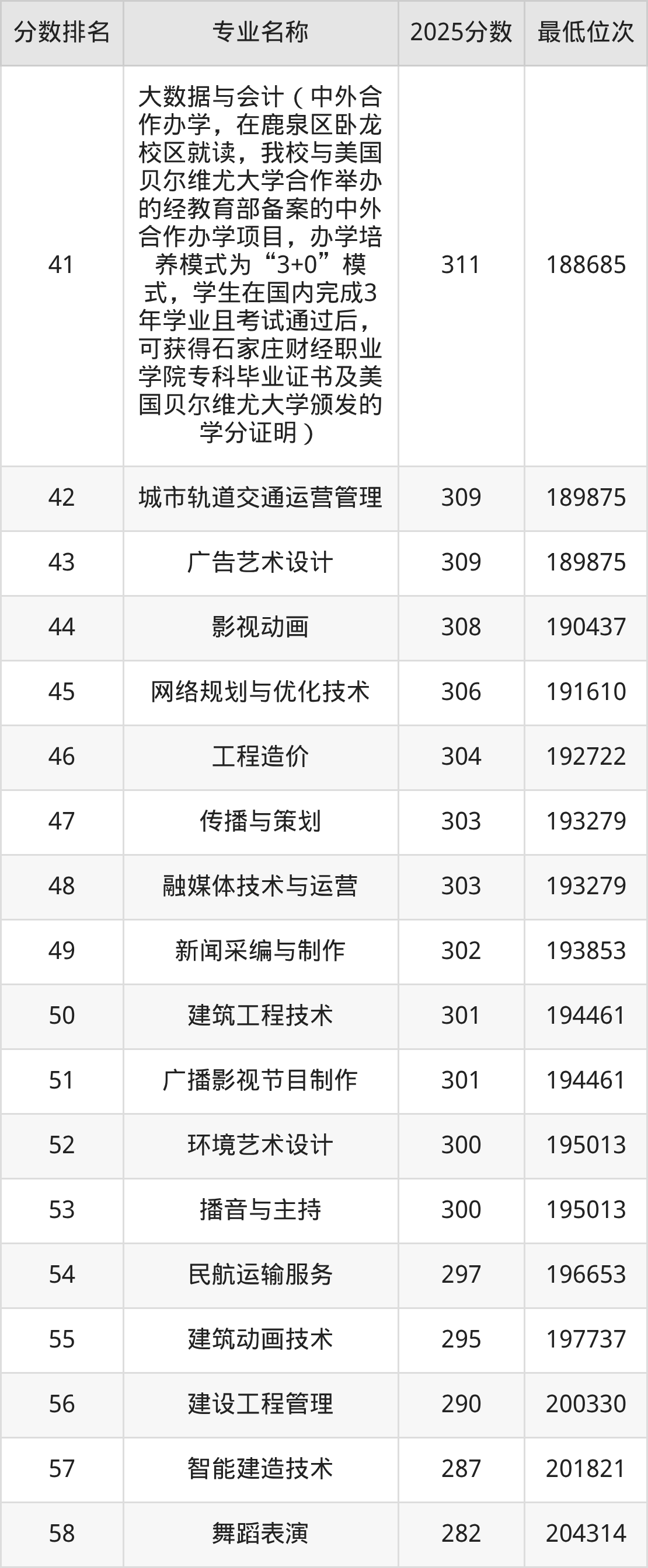 从河北物理类考生报考的角度看,石家庄财经职业学院最热门的王牌专业大数据与会计,2025年录取分是396分、位次是295438位,比最低分专业高了196分。