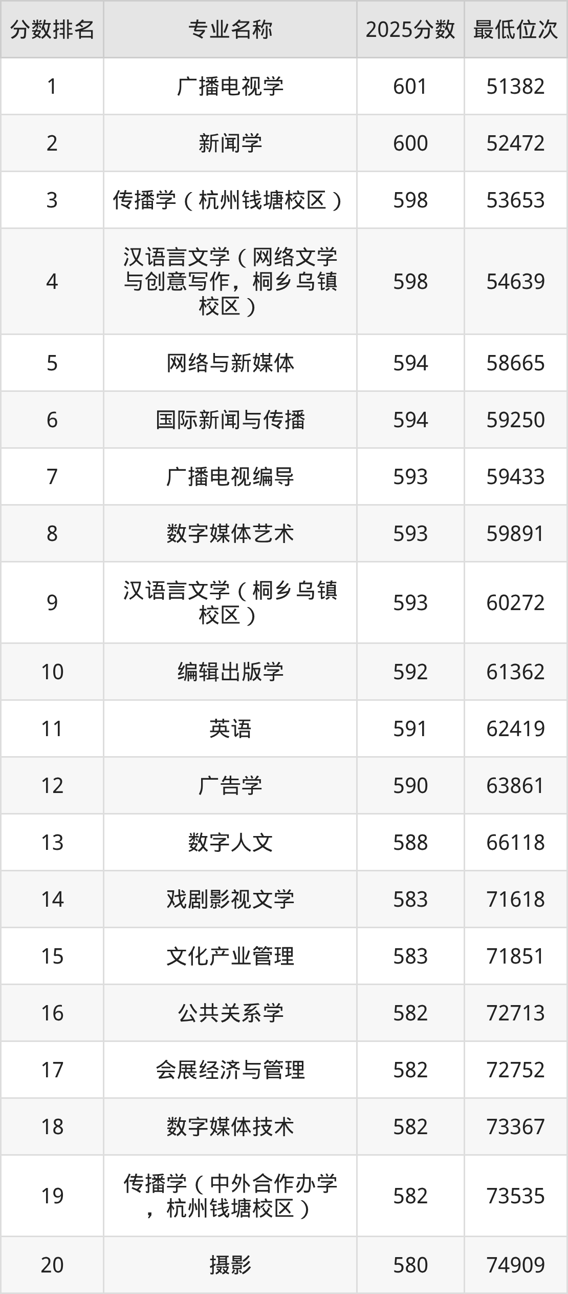 从浙江考生报考的角度看,浙江传媒学院最热门的王牌专业广播电视学,2025年录取分是601分、位次是51382位,比最低分专业高了57分。