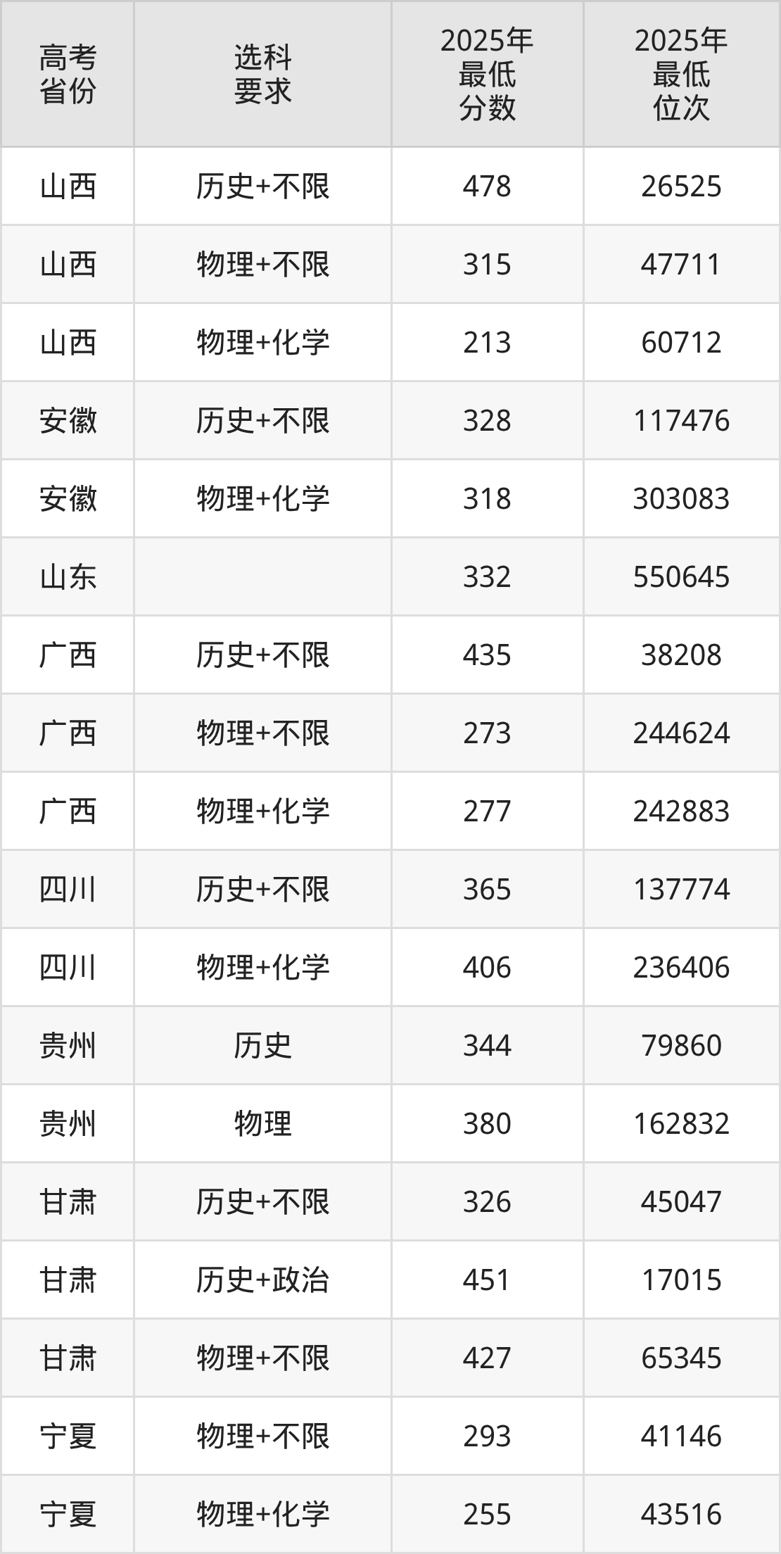 在2025年山西高考物理类招生时,211收分最低的是东北林业大学第304组(国家专项计划),最低分是448分、位次是100390位。再看拉萨师范学院,2025年在山西物理类的最低录取分数线是213分,最低位次是60712位。