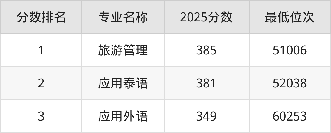 从重庆历史类考生报考的角度看,西双版纳职业技术学院最热门的王牌专业旅游管理,2025年录取分是385分、位次是51006位,比最低分专业高了36分。