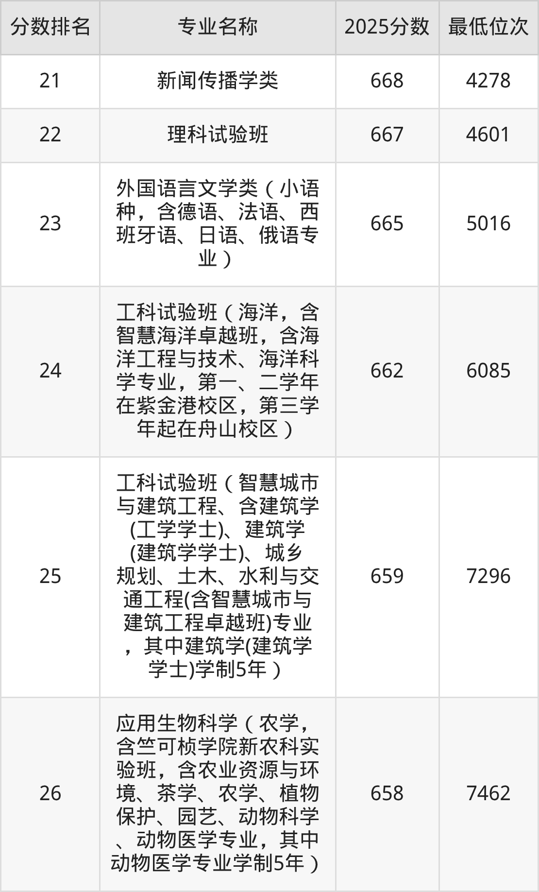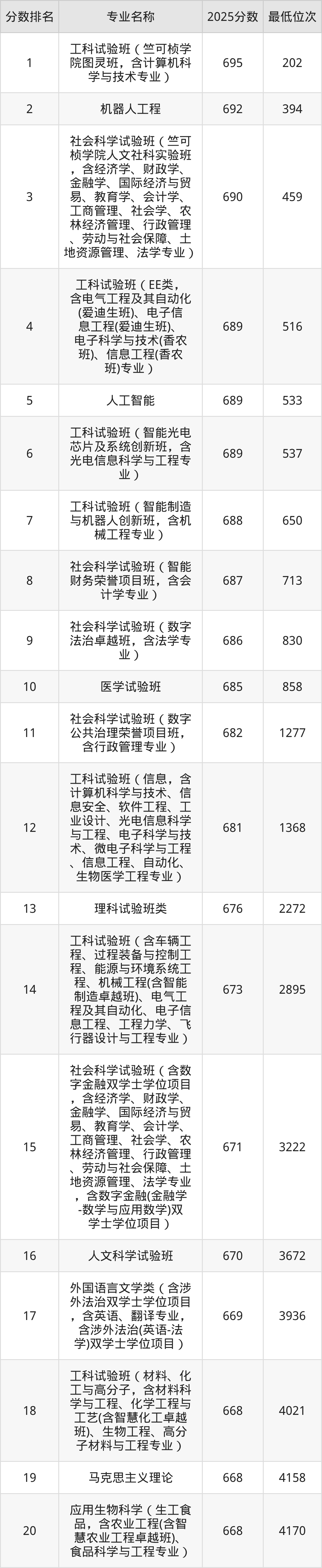从浙江考生报考的角度看,浙江大学最热门的王牌专业工科试验班,2025年录取分是695分、位次是202位,比最低分专业高了37分。