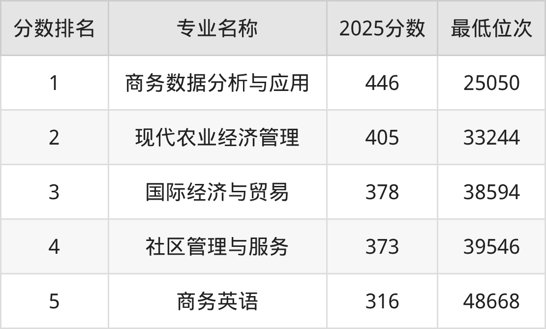 从辽宁历史类考生报考的角度看,辽宁石化职业技术学院最热门的王牌专业商务数据分析与应用,2025年录取分是446分、位次是25050位,比最低分专业高了130分。