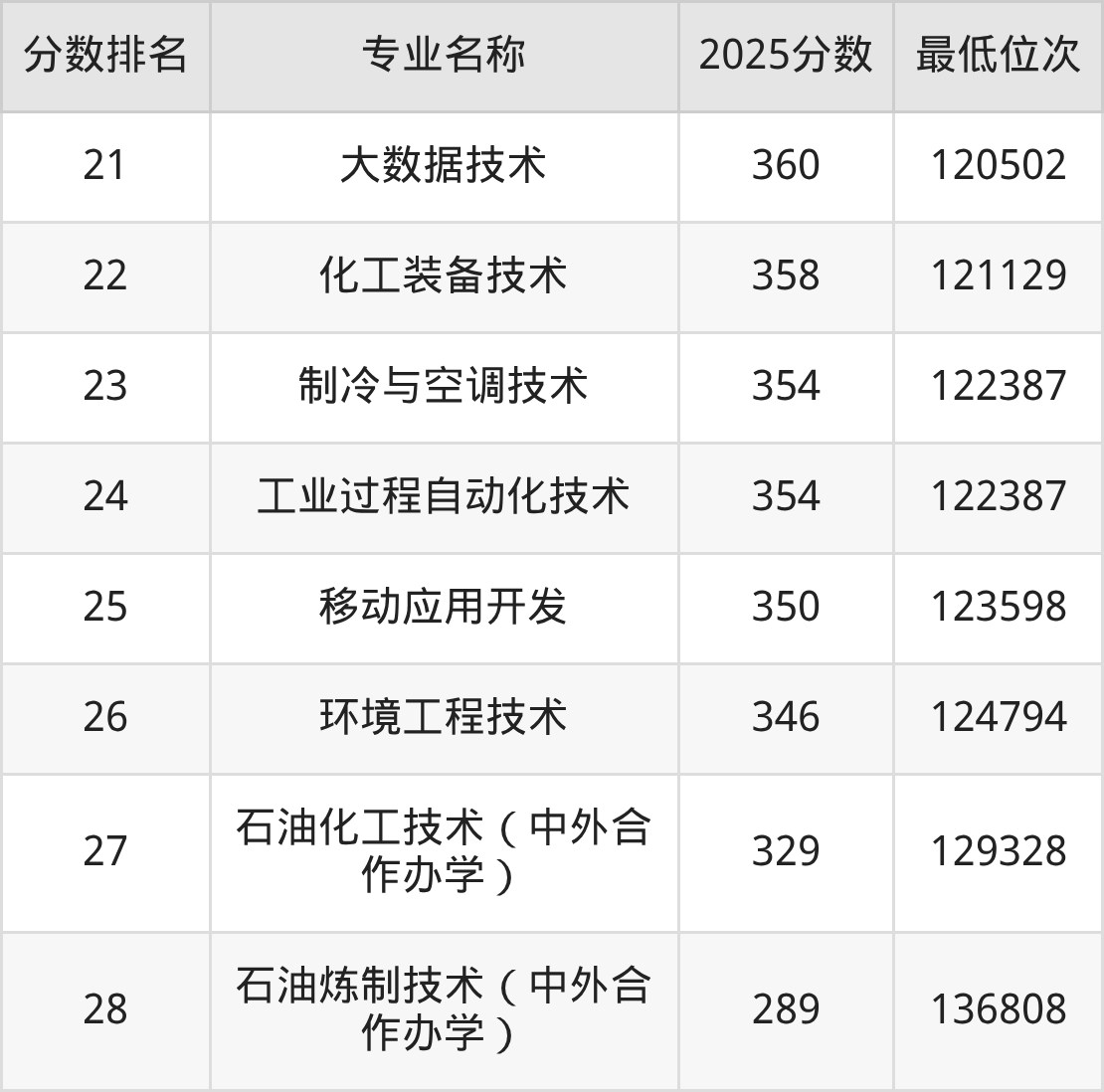 下图是辽宁石化职业技术学院物理类各专业录取分数线一览表(28个专业):