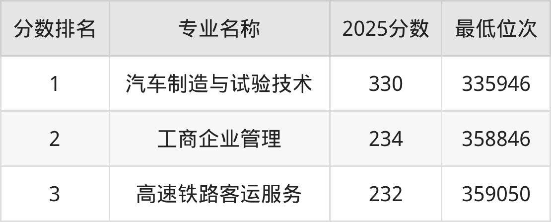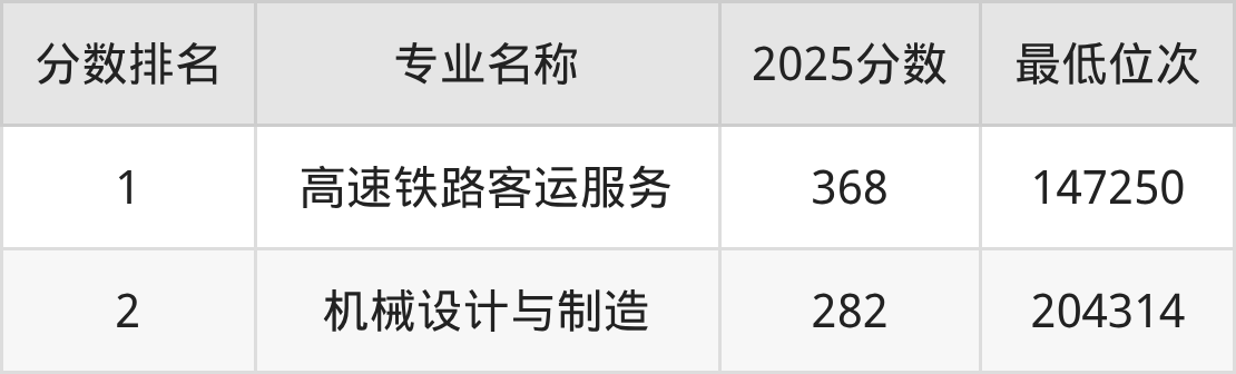 从河北历史类考生报考的角度看,湖南交通工程学院最热门的王牌专业高速铁路客运服务,2025年录取分是368分、位次是147250位,比最低分专业高了86分。