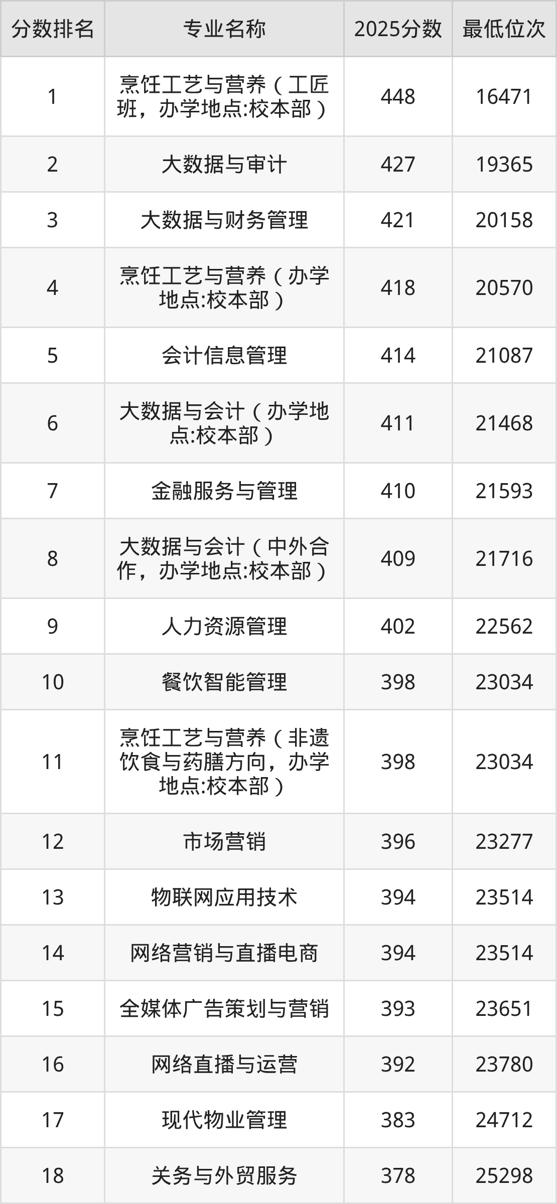 从内蒙古历史类考生报考的角度看,内蒙古商贸职业学院最热门的王牌专业烹饪工艺与营养,2025年录取分是448分、位次是16471位,比最低分专业高了70分。