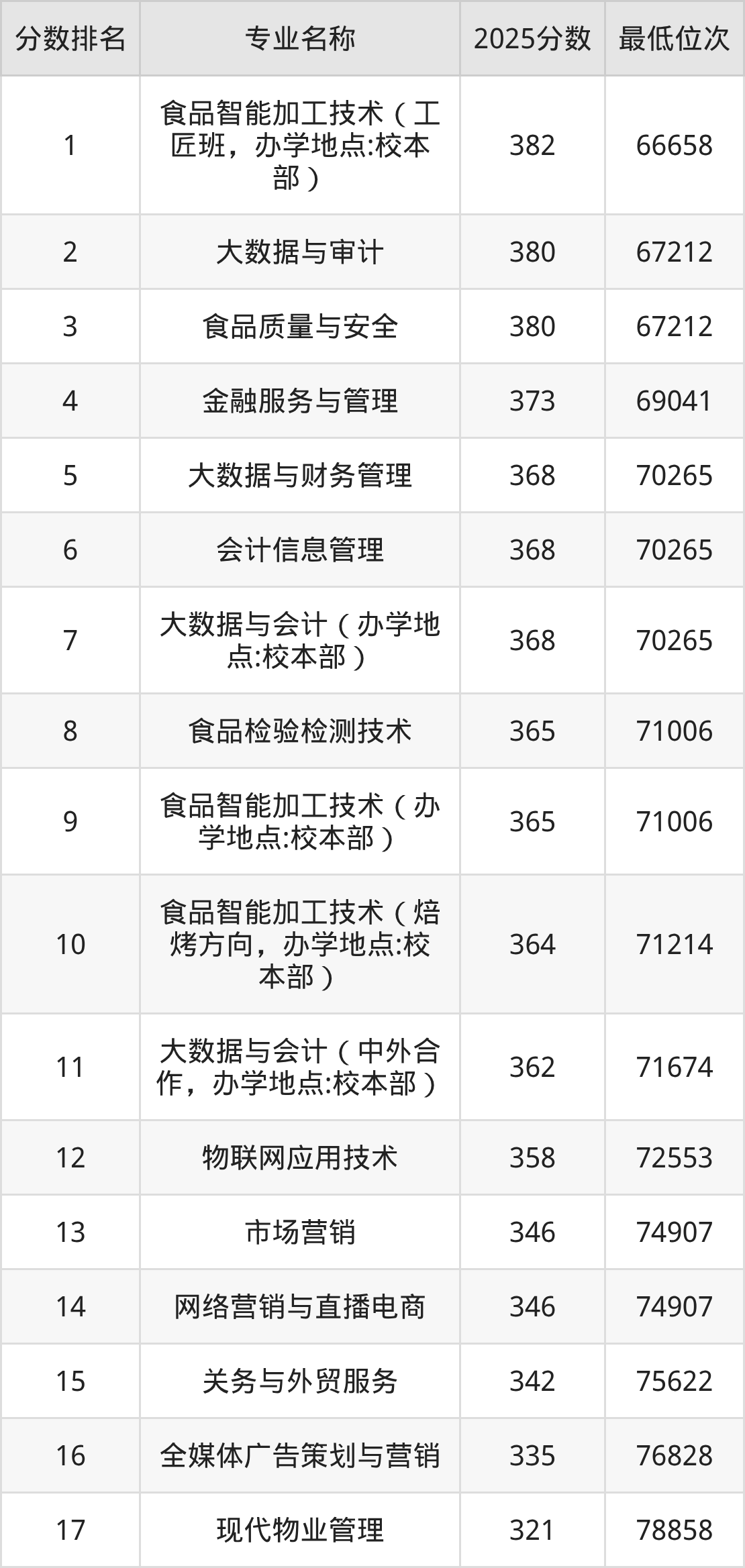 内蒙古商贸职业学院2025年在内蒙古高考物理类,收分最高的王牌专业是食品智能加工技术,考生至少需要382分、66658位才能被录取。
