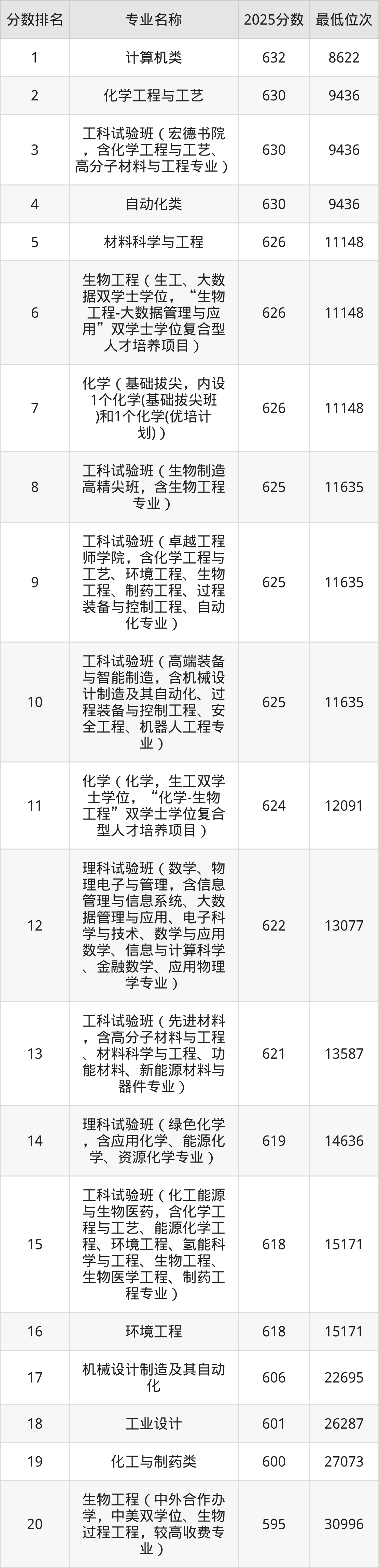 三、北京化工大学各专业录取分数线及位次