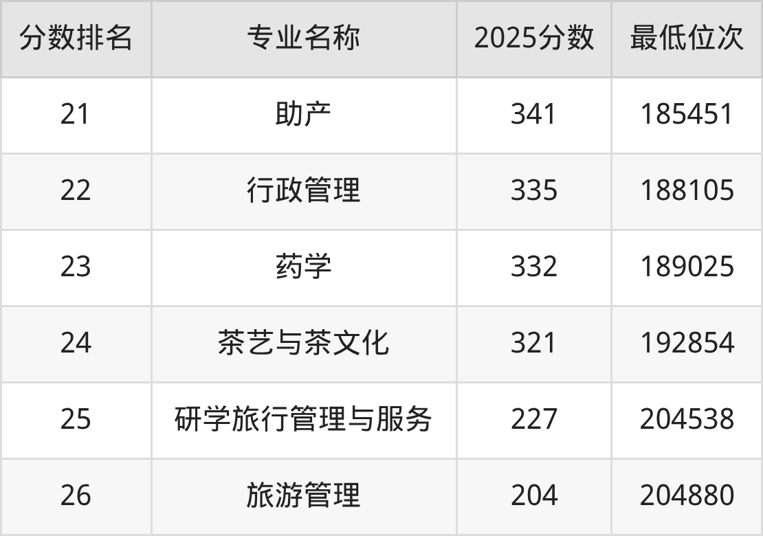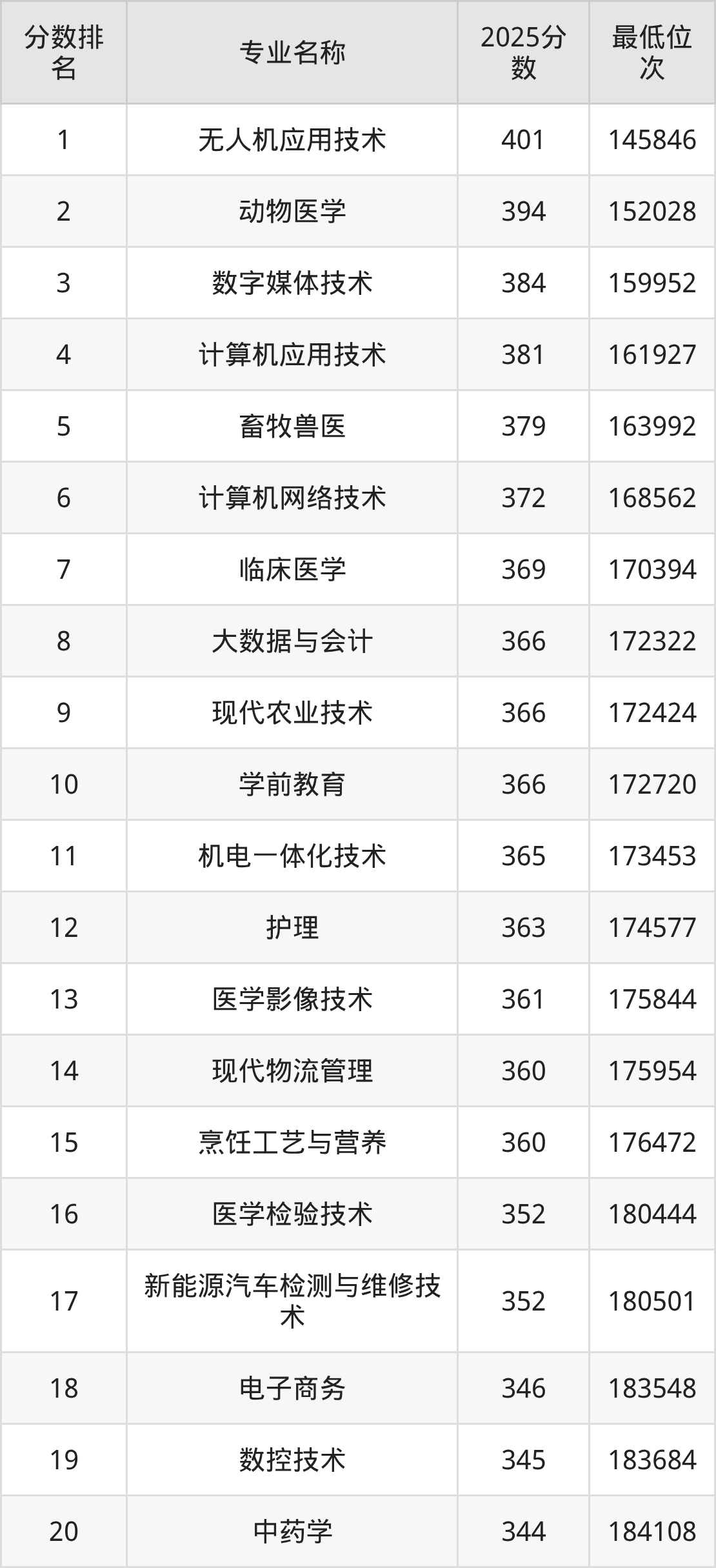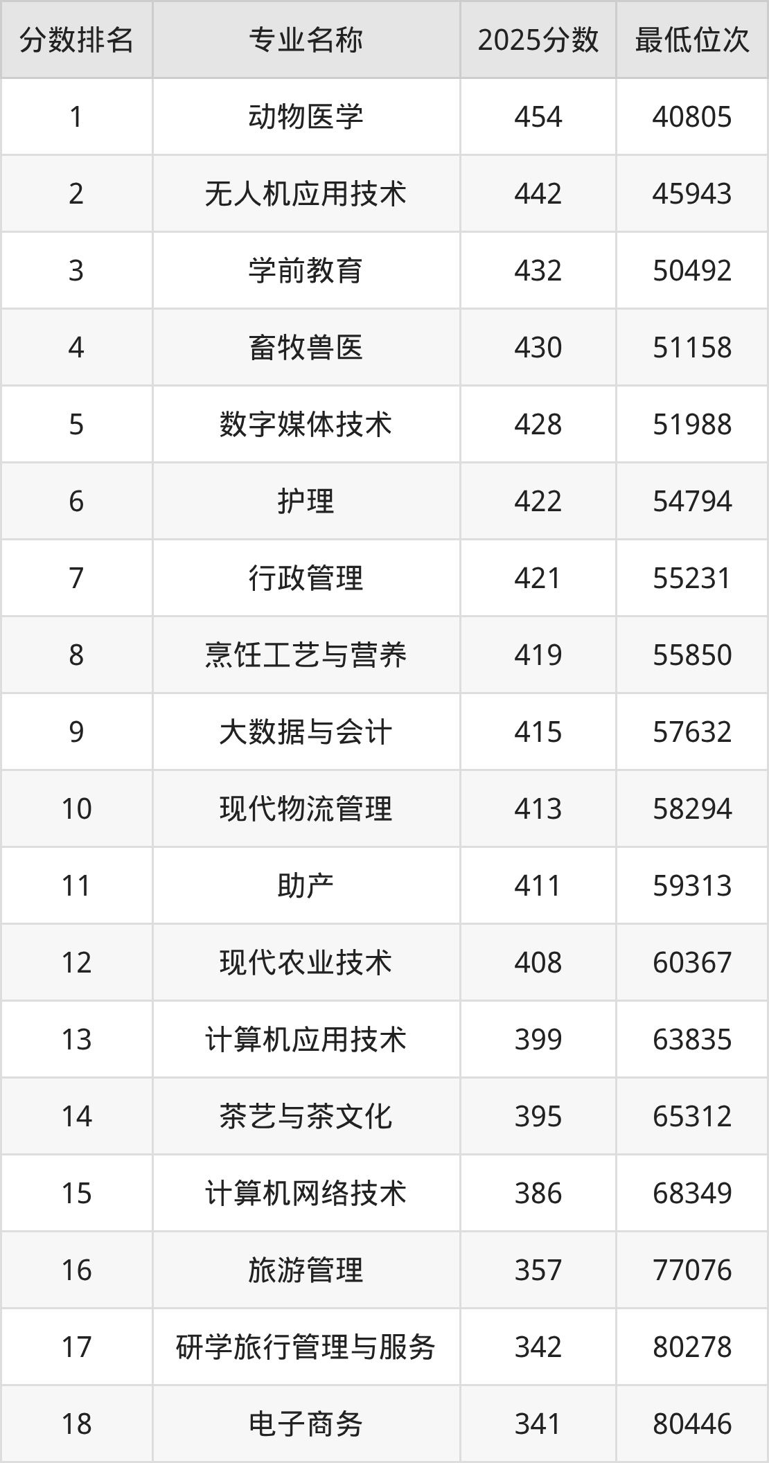 从贵州历史类考生报考的角度看,安顺职业技术学院最热门的王牌专业动物医学,2025年录取分是454分、位次是40805位,比最低分专业高了113分。