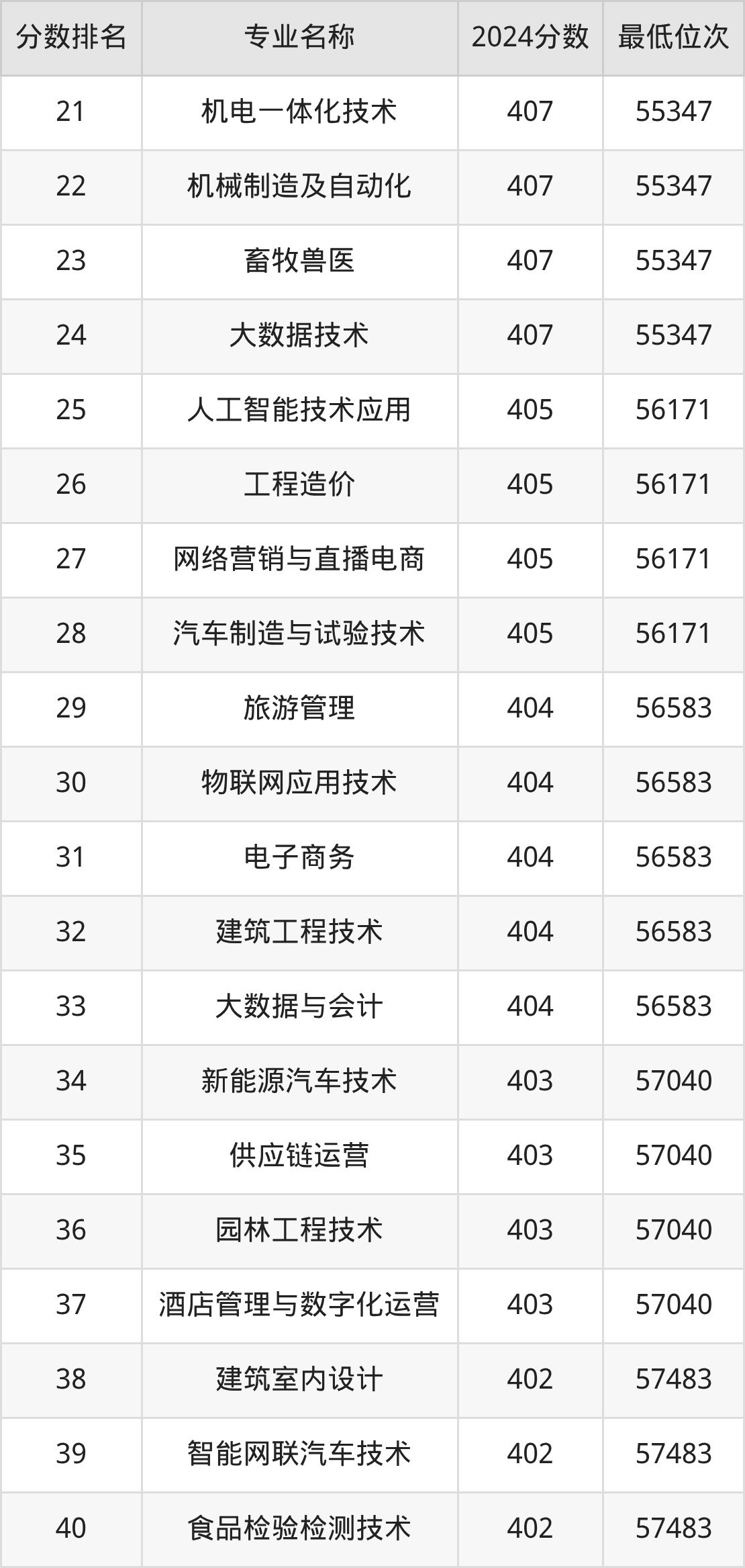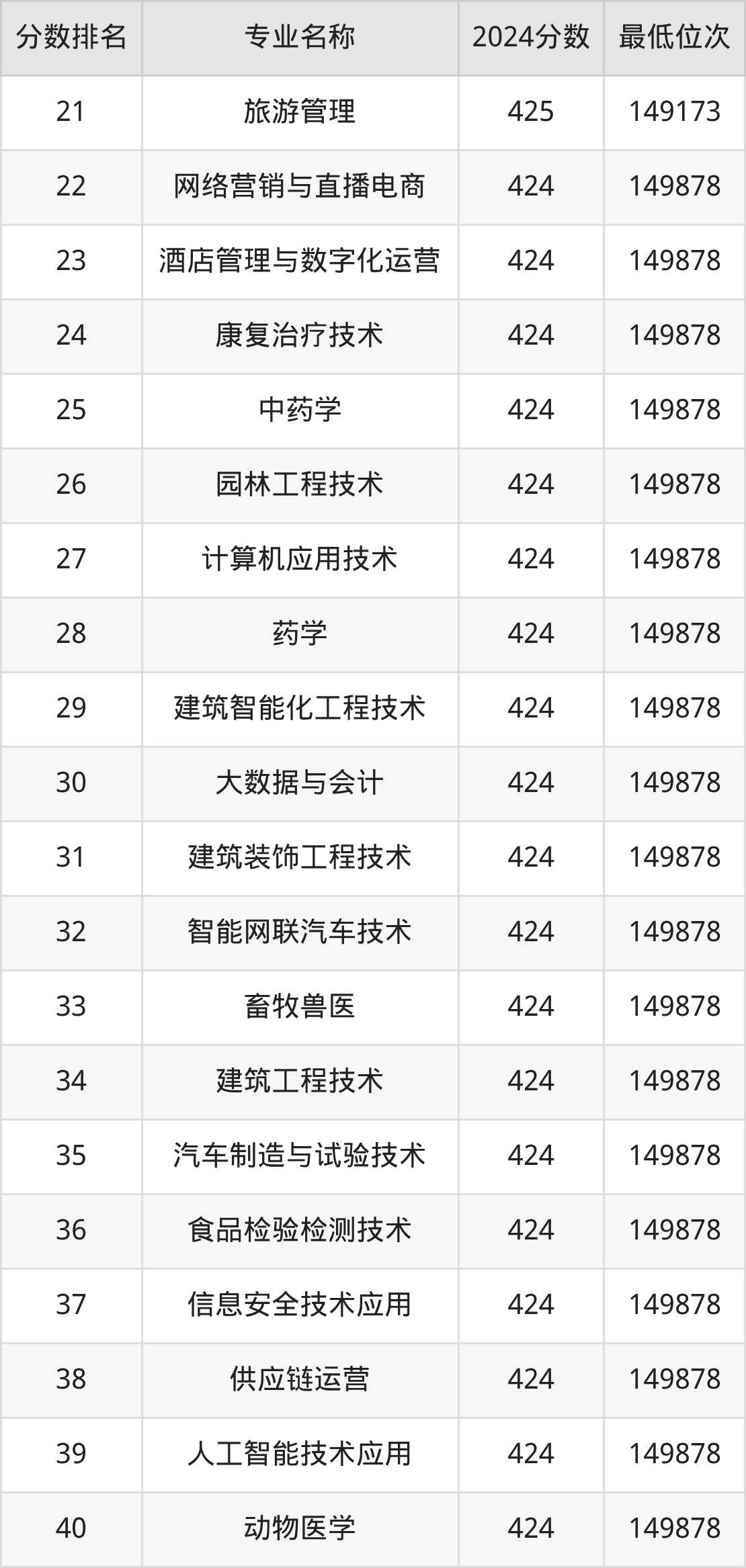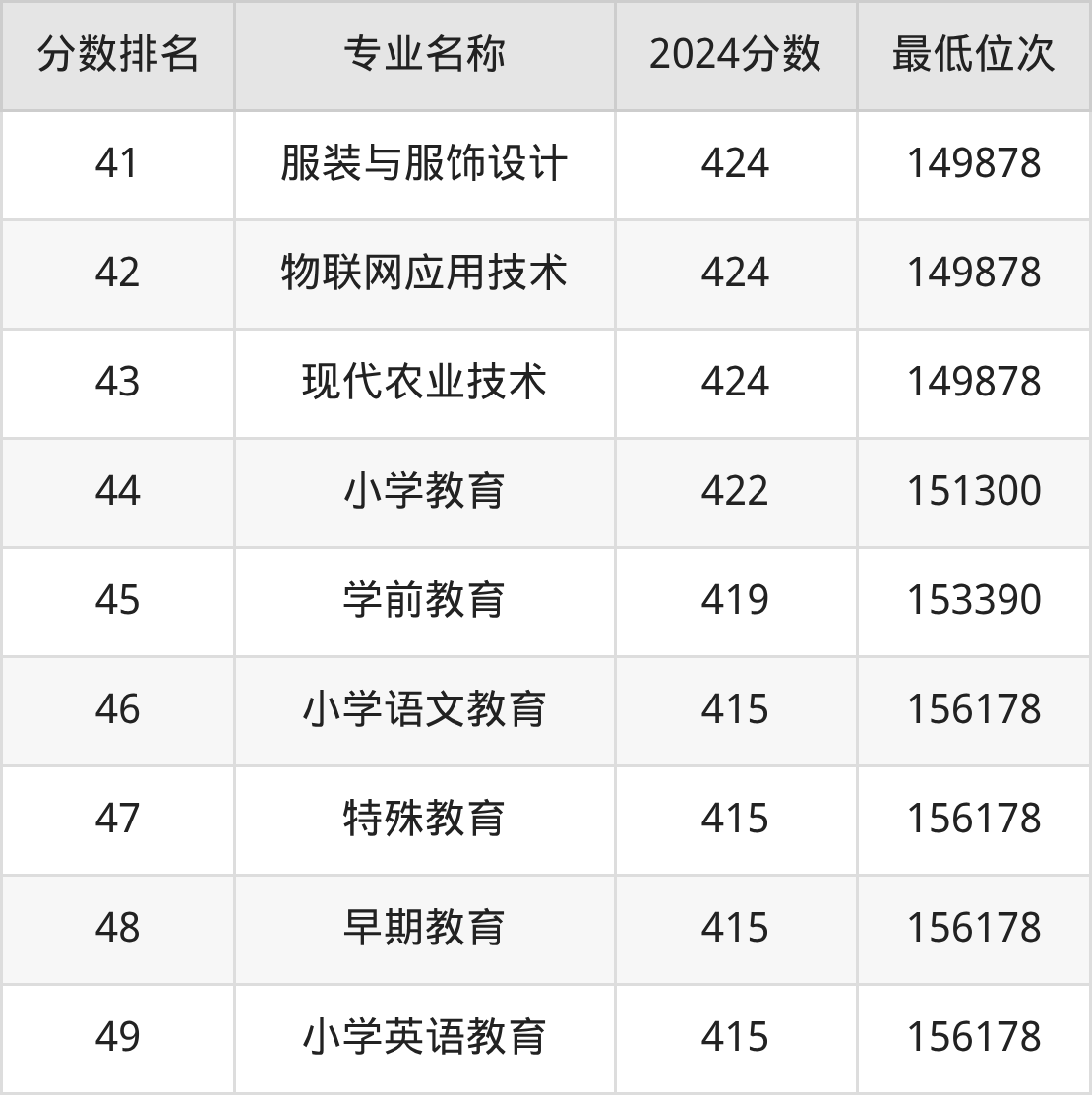 下方表格展示的是襄阳职业技术学院其余上榜金平果2025年专业排名榜单的所有数据。大家可以看看自己心仪的专业,在襄阳职业技术学院各专业中处于什么水平。如果你的心仪专业是排名靠前的小学英语教育、大数据技术等专业,则建议大家重点考虑襄阳职业技术学院。如果你的心仪专业是襄阳职业技术学院排名靠后的物联网应用技术、建筑工程技术专业,则建议大家在能上的大学中继续看看,有没有比襄阳职业技术学院专业实力更强的院校!