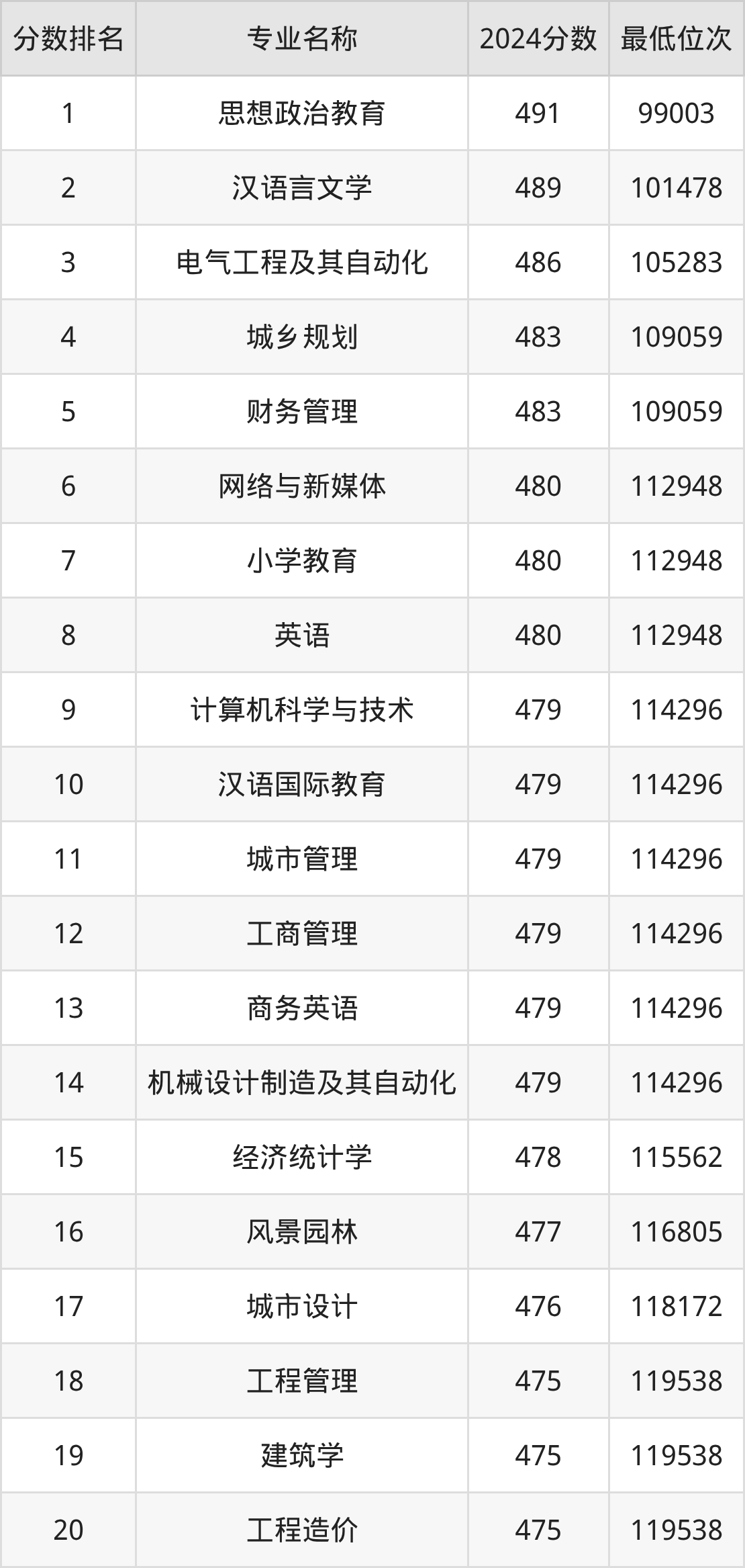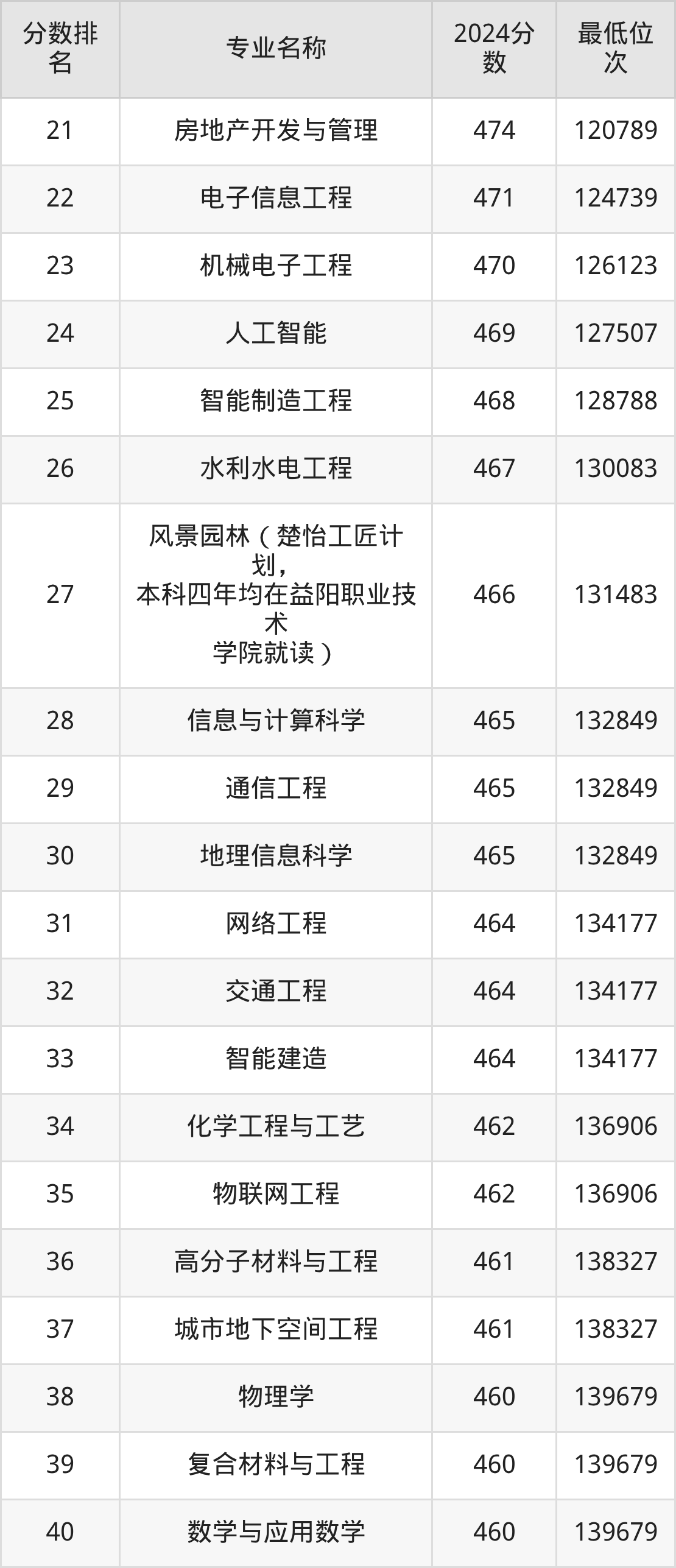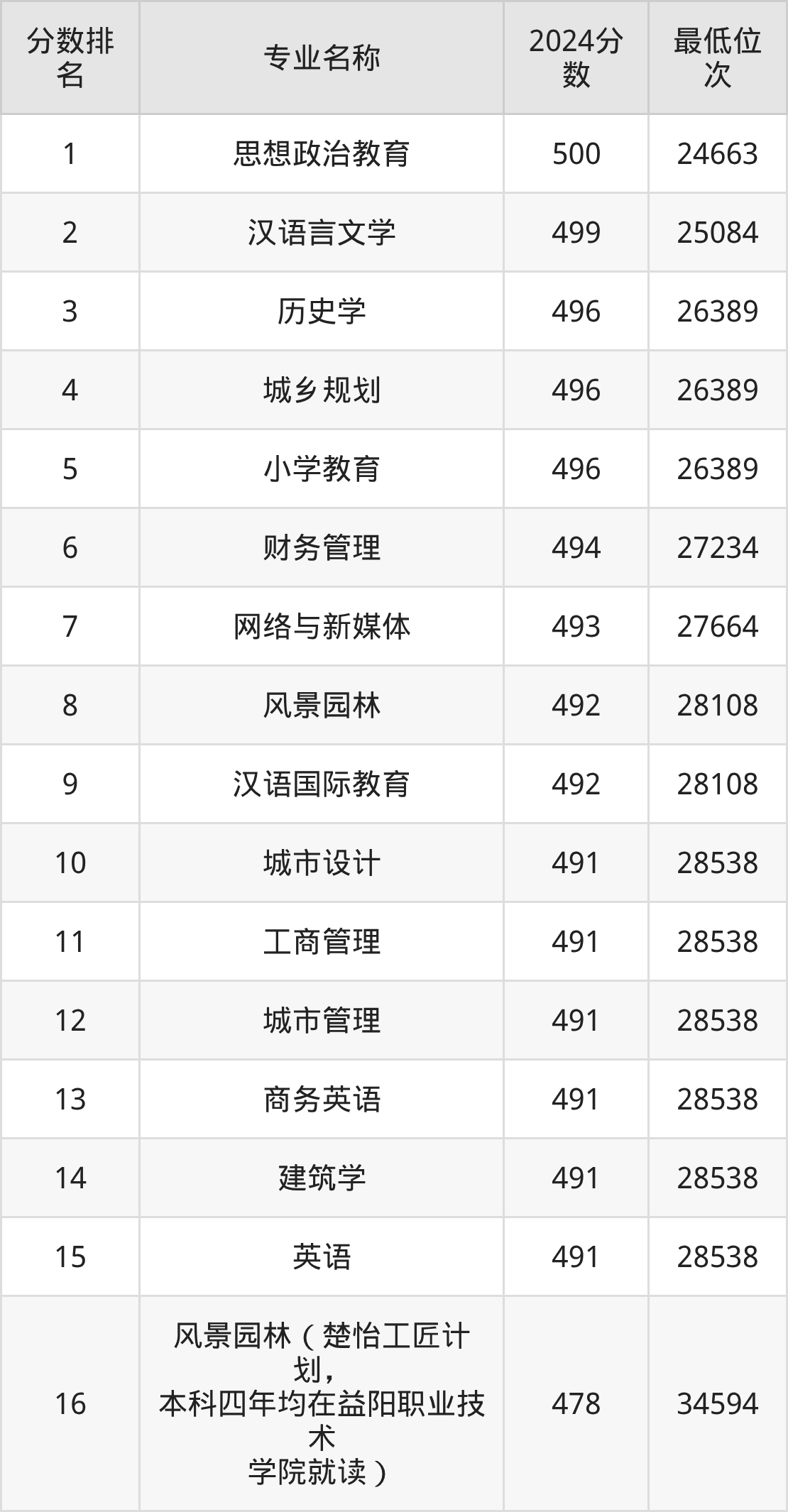 从湖南历史类考生报考的角度看,湖南城市学院最热门的王牌专业思想政治教育,2025年录取分是500分、位次是24663位,比最低分专业高了22分。