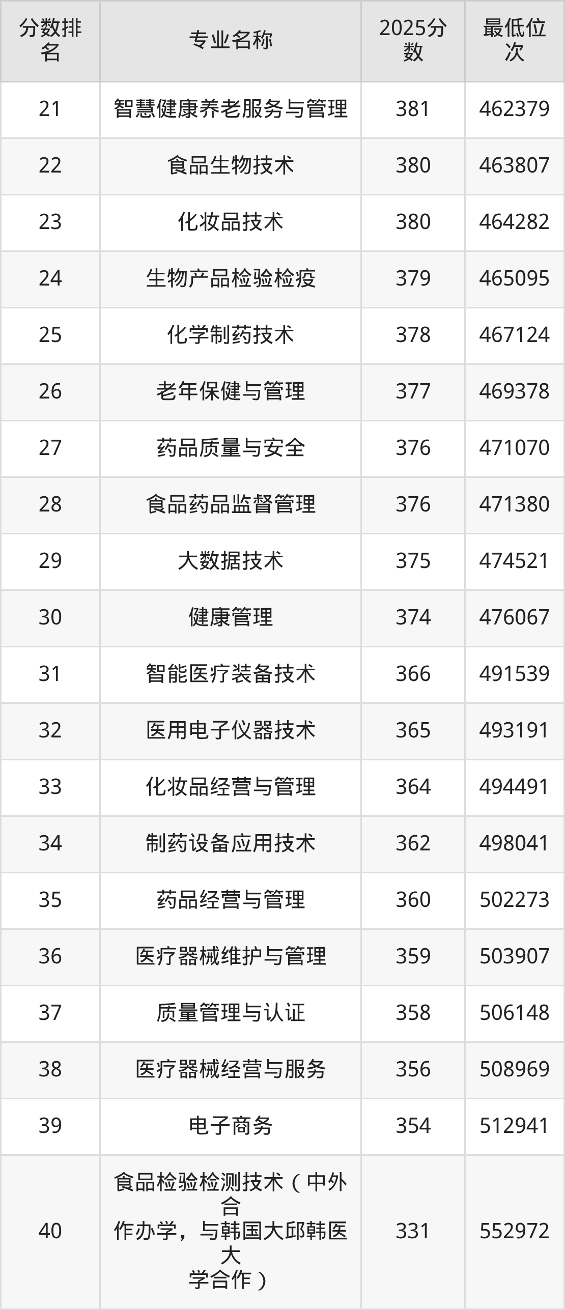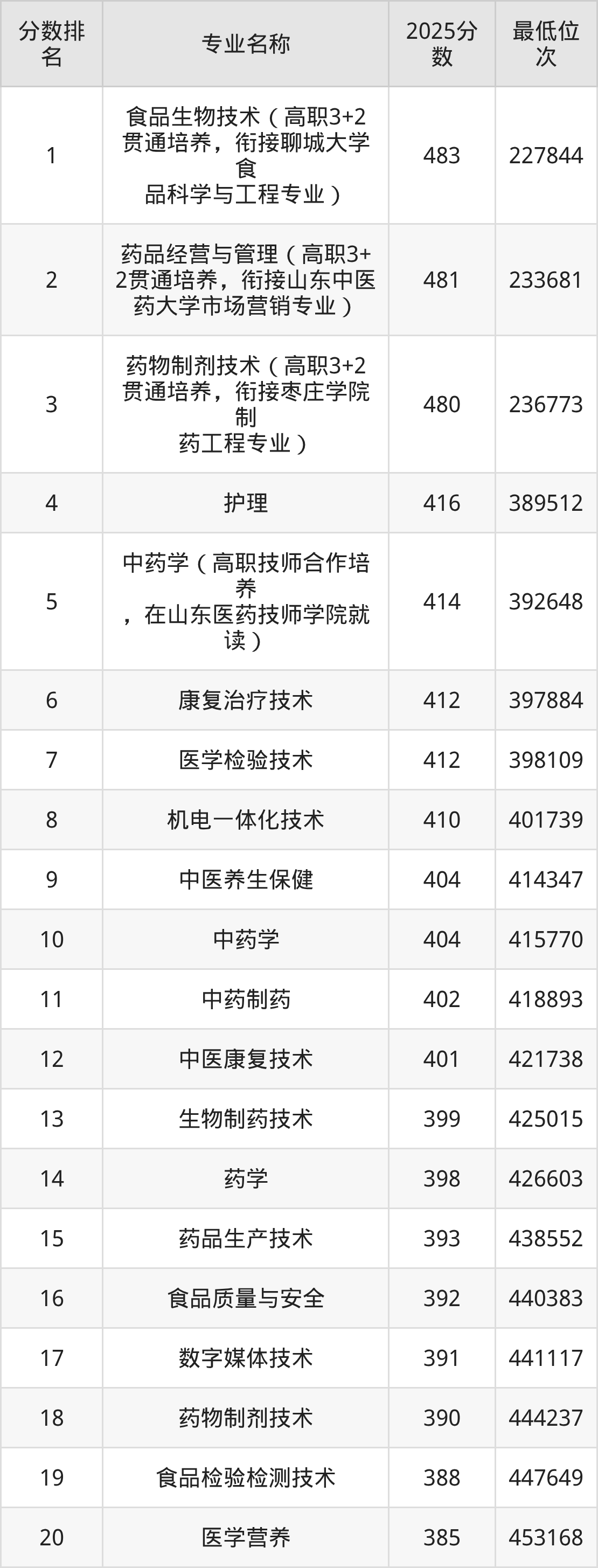 从山东考生报考的角度看,山东药品食品职业学院最热门的王牌专业食品生物技术,2025年录取分是483分、位次是227844位,比最低分专业高了152分。