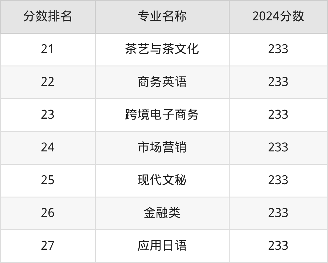 下方表格展示的是天津商务职业学院其余上榜金平果2025年专业排名榜单的所有数据。大家可以看看自己心仪的专业,在天津商务职业学院各专业中处于什么水平。如果你的心仪专业是排名靠前的国际金融、国际商务等专业,则建议大家重点考虑天津商务职业学院。如果你的心仪专业是天津商务职业学院排名靠后的大数据与会计、大数据技术专业,则建议大家在能上的大学中继续看看,有没有比天津商务职业学院专业实力更强的院校!