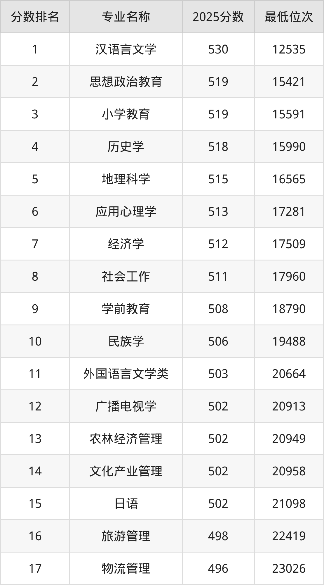 从贵州历史类考生报考的角度看,黔南民族师范学院最热门的王牌专业汉语言文学,2025年录取分是530分、位次是12535位,比最低分专业高了34分。
