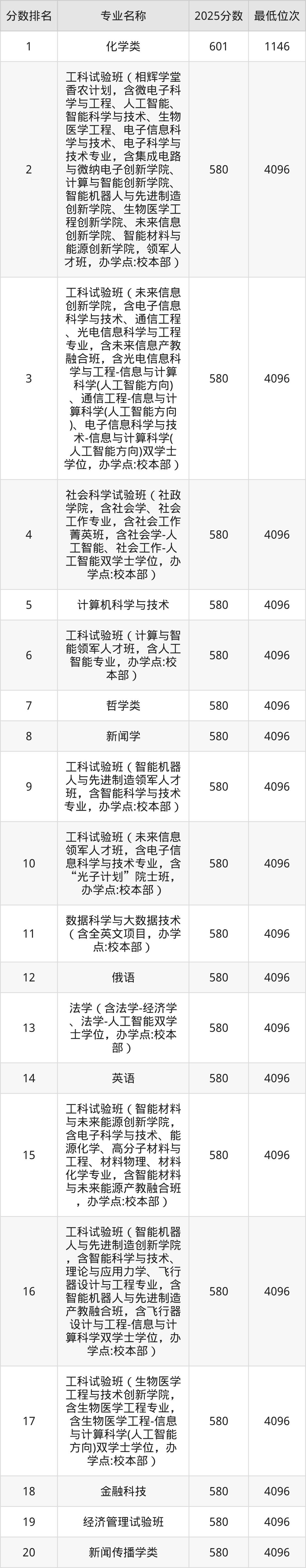 从上海考生报考的角度看,复旦大学最热门的王牌专业化学类,2025年录取分是601分、位次是1146位,比最低分专业高了21分。