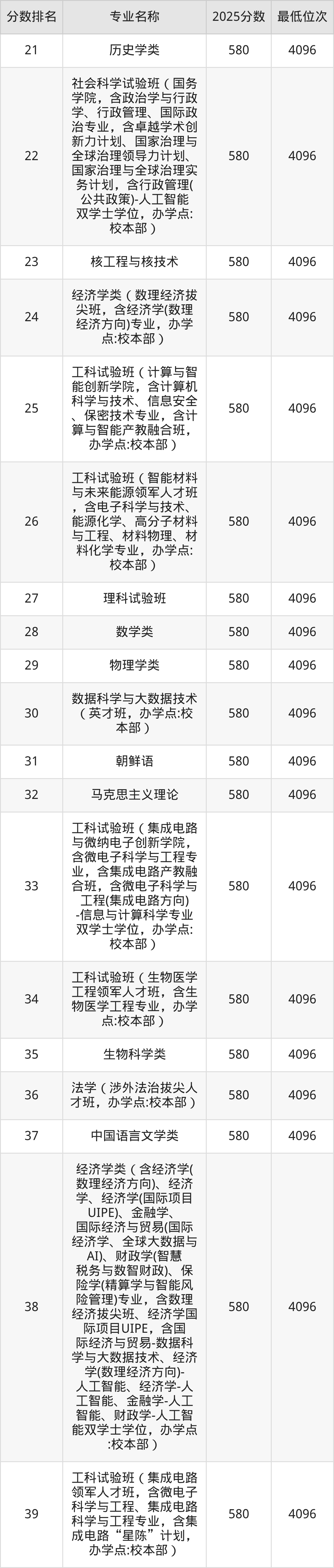 下图是复旦大学各专业录取分数线一览表(39个专业):