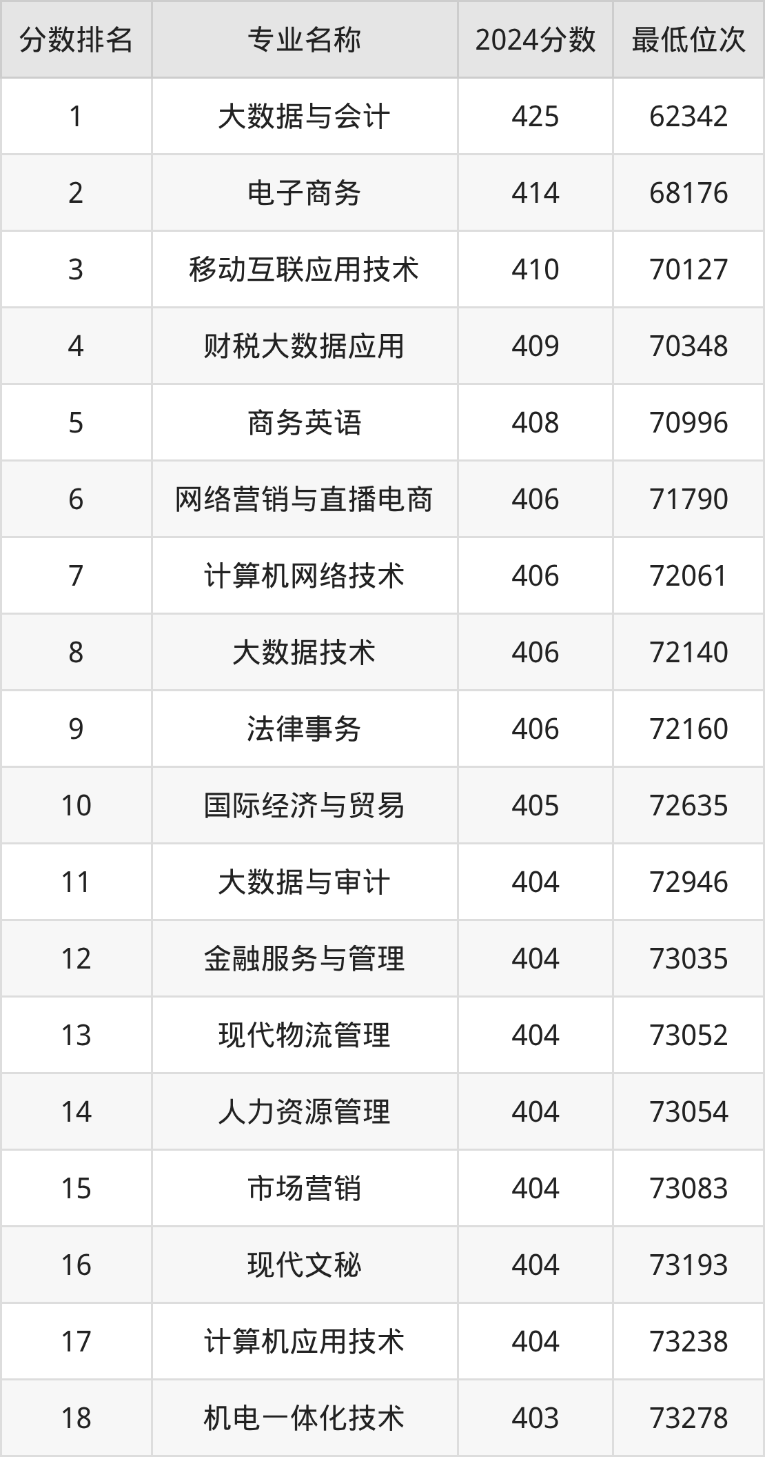安徽商贸职业技术学院2025年在安徽高考历史类,收分最高的王牌专业是大数据与会计,考生至少需要425分、62342位才能被录取。