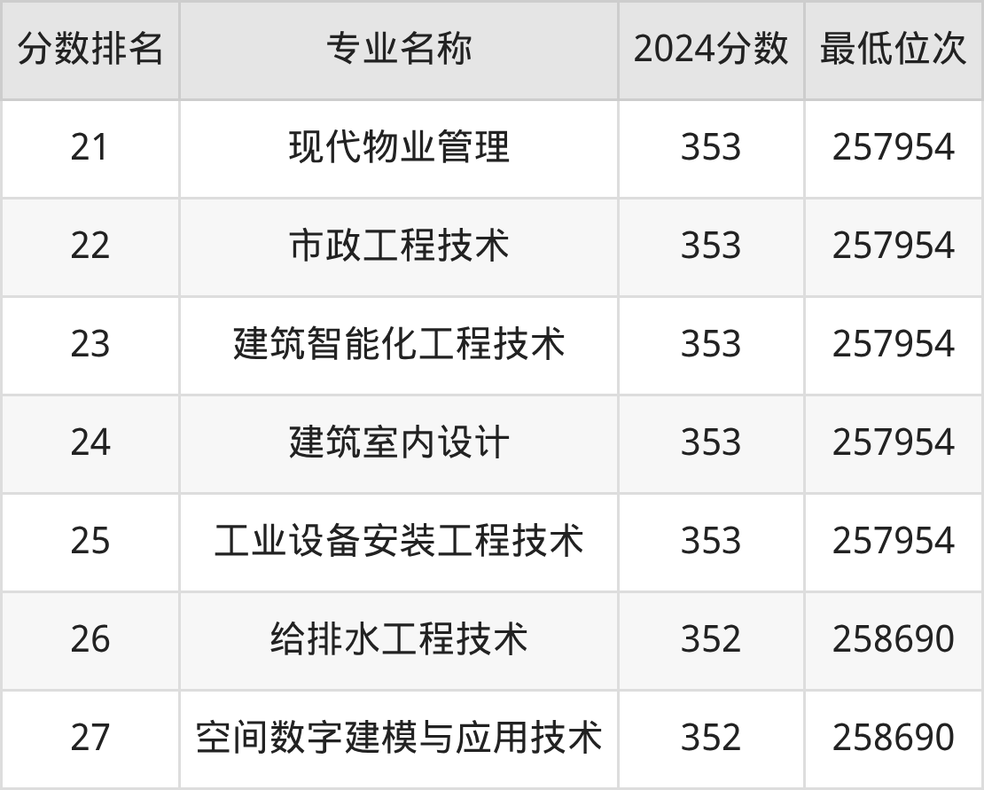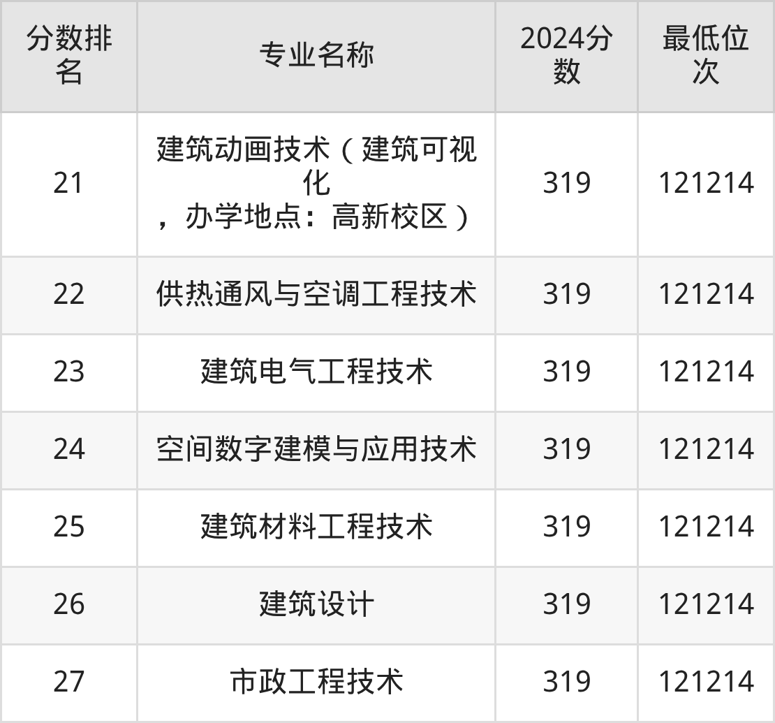 下方表格展示的是湖南城建职业技术学院其余上榜金平果2025年专业排名榜单的所有数据。大家可以看看自己心仪的专业,在湖南城建职业技术学院各专业中处于什么水平。如果你的心仪专业是排名靠前的供热通风与空调工程技术、建筑电气工程技术等专业,则建议大家重点考虑湖南城建职业技术学院。如果你的心仪专业是湖南城建职业技术学院排名靠后的建筑装饰工程技术、风景园林设计专业,则建议大家在能上的大学中继续看看,有没有比湖南城建职业技术学院专业实力更强的院校!