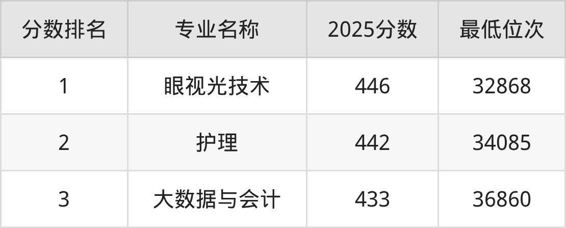 从重庆历史类考生报考的角度看,成都职业技术学院最热门的王牌专业眼视光技术,2025年录取分是446分、位次是32868位,比最低分专业高了13分。